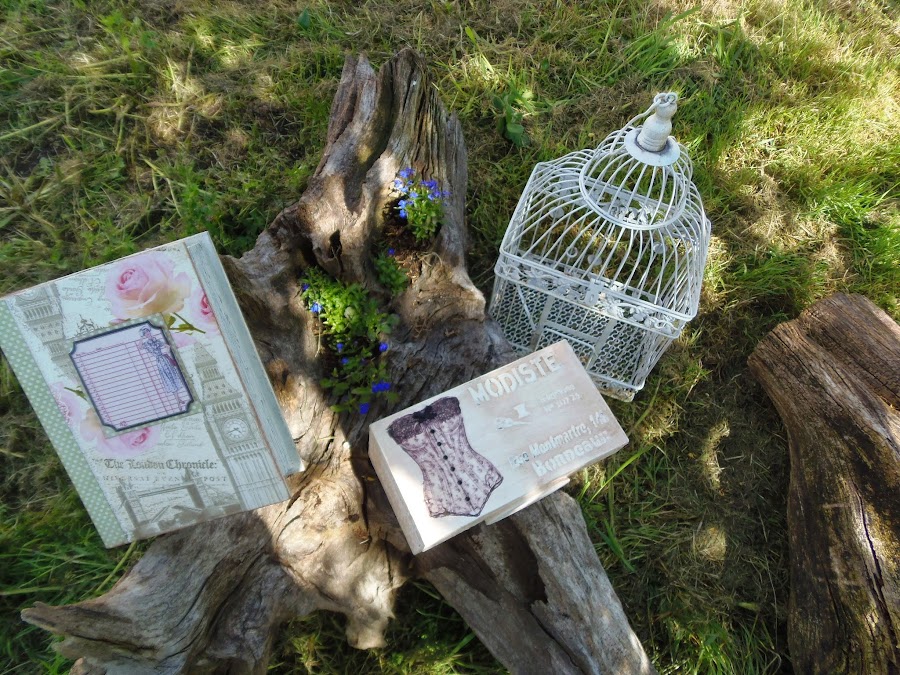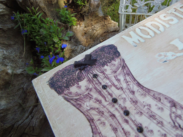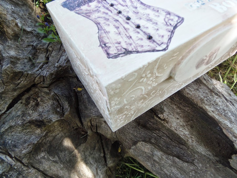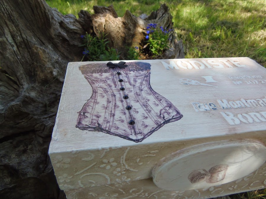 Y esta caja para los hilos decorada con stencil en relieve y transfer de un corset qué me encanta,a pesar de qué se me ha roto un trocito.