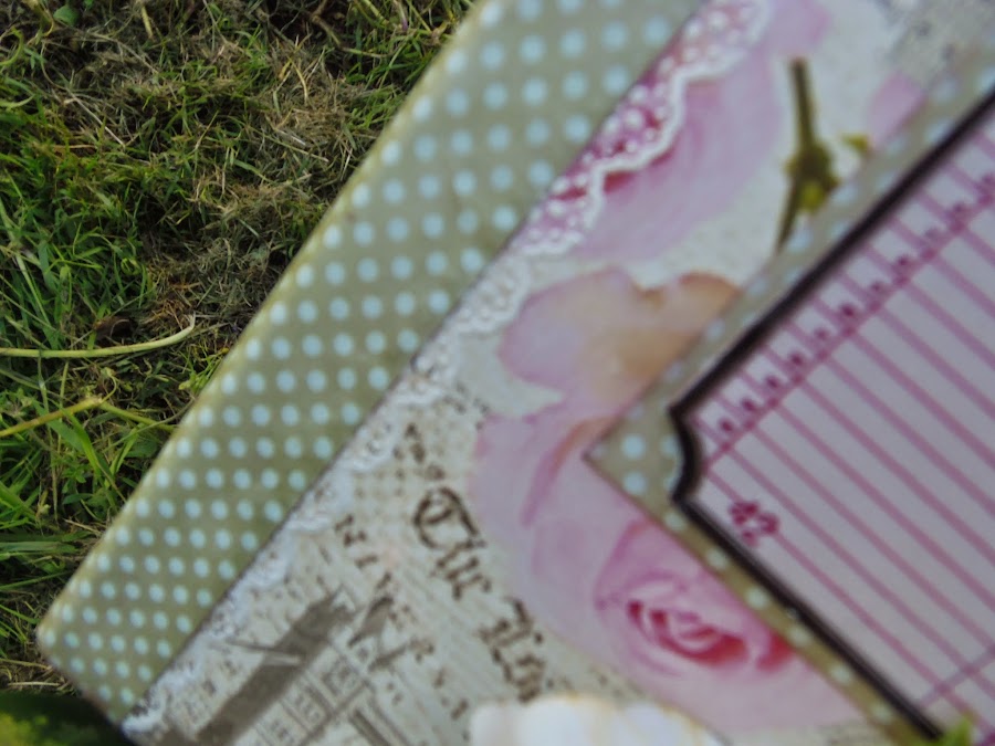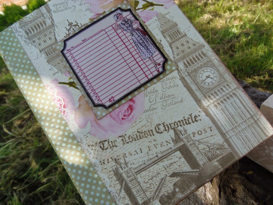Es una caja libro con decoupage,con una servi preciosa para mi gusto,el lomo lo he forrado con papel scrap de topitos y una puntilla de stencil en relieve