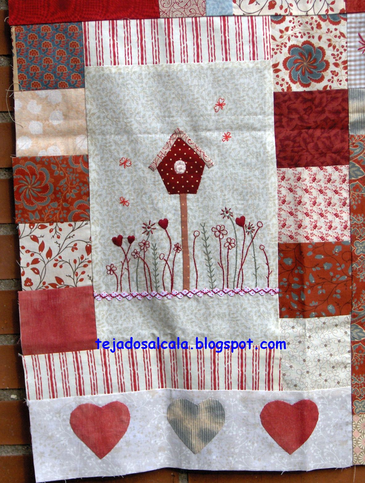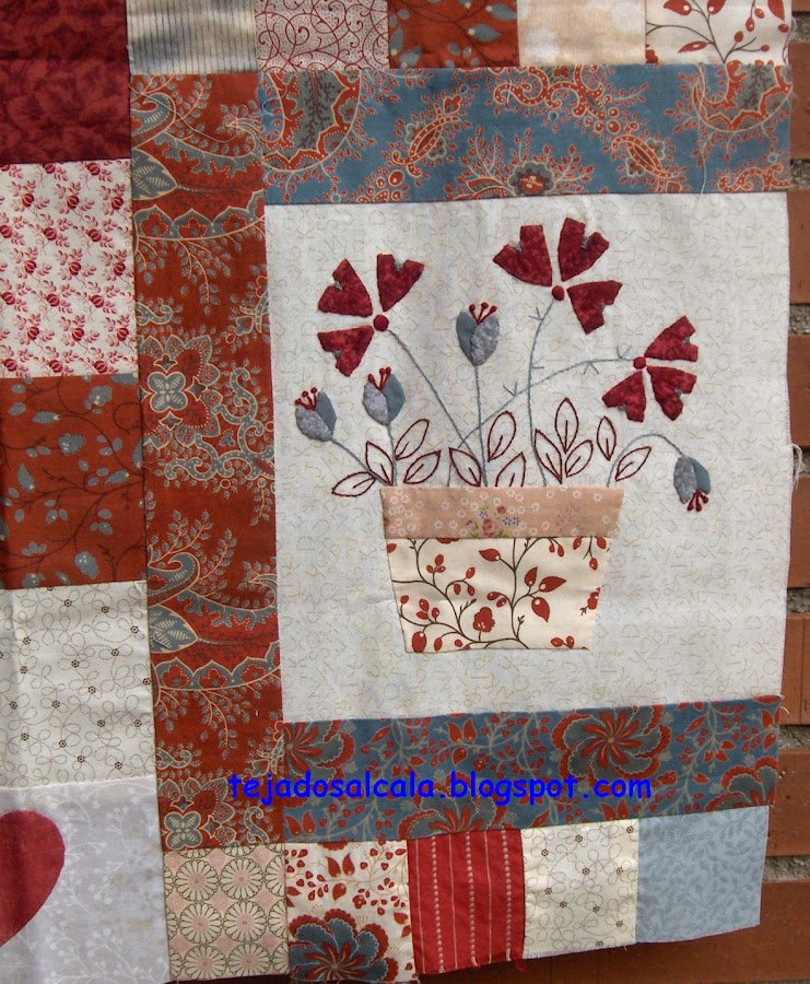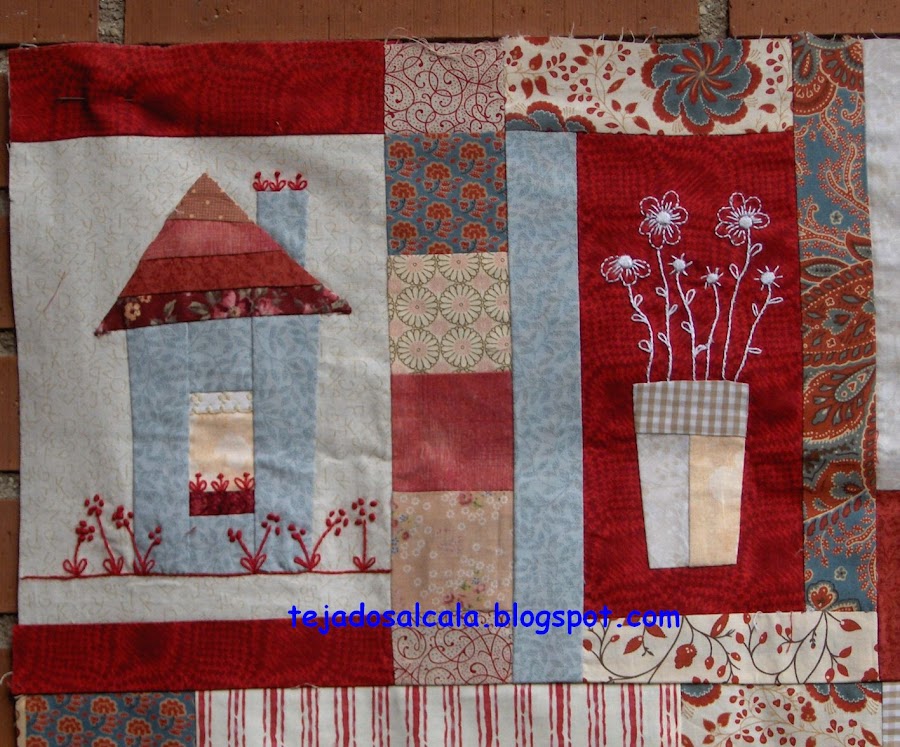 Mi último trabajo ha sido un camino de mesa con un pequeño tapete haciendo juego. La base son hexágonos en tonos azules y sobre éstos, centrados, otros hexágonos más pequeños en blanco. El acolch ...