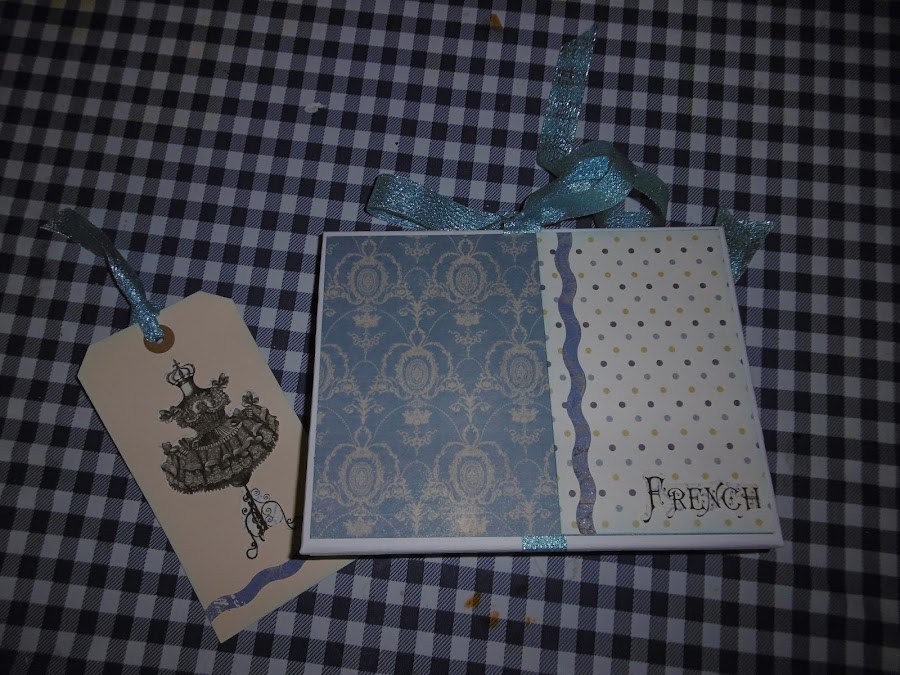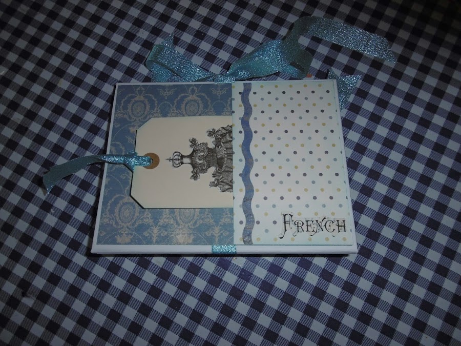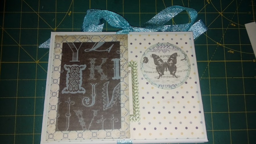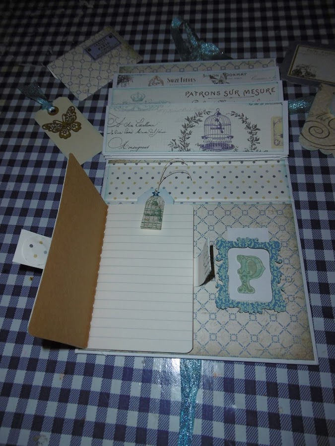 El interior: le hice un archivador tipo fuelle en una de las caras y en la otra pegue una libreta decorada y un marquito con la inicial de la destinataria pensado para poner una foto de carnet.
