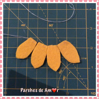Aparte tomamos otra pieza de tela de fieltro de color amarillo y sacamos de la misma forma que la base del alfiletero cada uno de los 4 pétalos de nuestra flor, cortamos y entrelazamos por la parte superior con hilo y aguja cada uno de ellos y de esta misma manera vamos realizando con telas a tu gusto cada una de las piezas que conforman este bello alfiletero. Te parece? A que no es tan difícil? PARA NADA Vamos anímate ! y si aun no has terminado tu primera parte NO te desanimes......... te estamos esperando....
