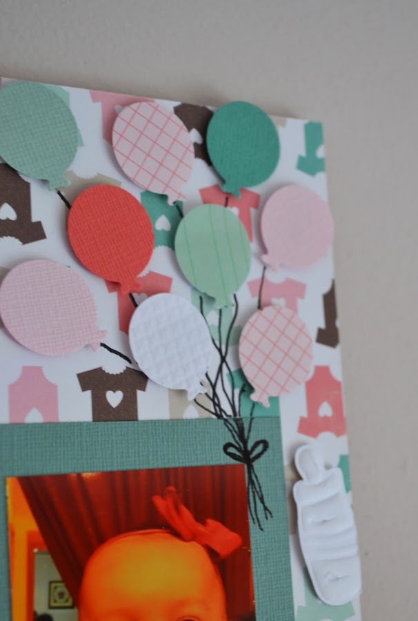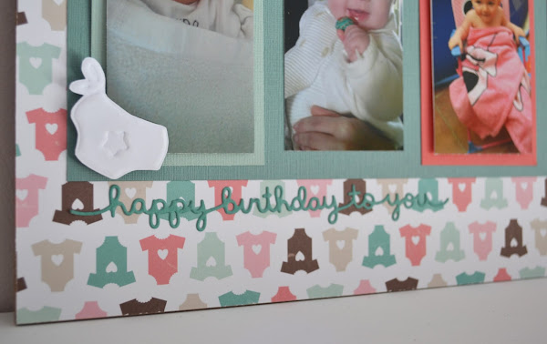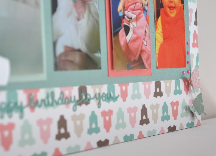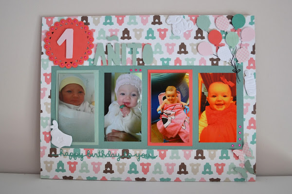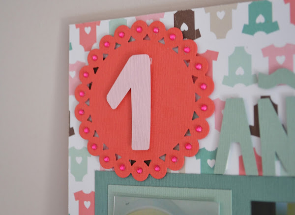 El cuadro está decorado con un papel estampado de bodys de bebés en color rosa, marrón y azul verdoso. Las fotos de la pequeña según ha ido creciendo están colocadas en el centro y el resto de la decoración está en los laterales: unos globitos en la esquina derecha y un número uno en la izquierda.
