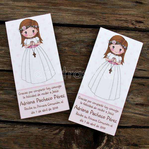 Pero además de las banderolas, Encarni me pidió que le hiciera unas pequeñas tarjetas, del tamaño de una tarjeta de visita, con el mismo dibujo de niña de Comunión que iba en el resto de elementos. Estas tarjetas las usa ella para algo que me parece un detalle muy bonito: se trata de un “Árbol de los deseos”, que consiste en que cada invitado escriba un mensaje bonitopara la protagonista de la celebración en una de estas tarjetas y lo deje colgado en una rama del árbol que ella prepara junto con la mesa dulce.