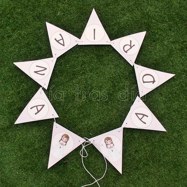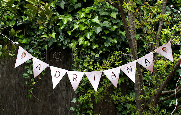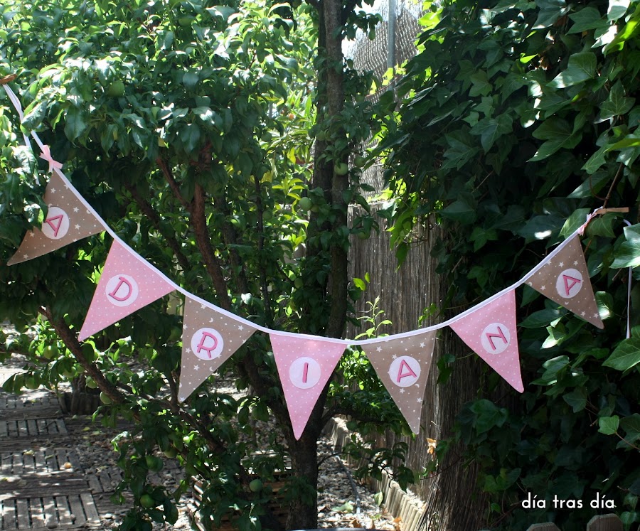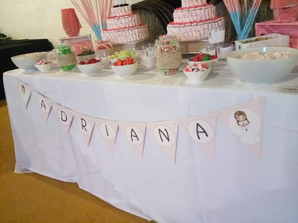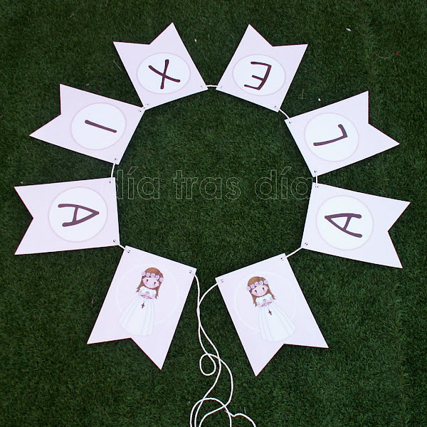 Pero lo que no sabían Carmen y Susana es que, además de estas cosas que ellas me habían pedido, en la celebración iba a haber más detalles de Día tras Día. Y es que mi amiga Encarni, el alma de Coco Eventos, iba a ser la encargada de preparar las mesas dulces para Alexia y Adriana, que celebraban juntasla Primera Comunión. Y ella me pidió que le hiciera unas banderolas personalizadas con sus nombres para decorar las mesas.