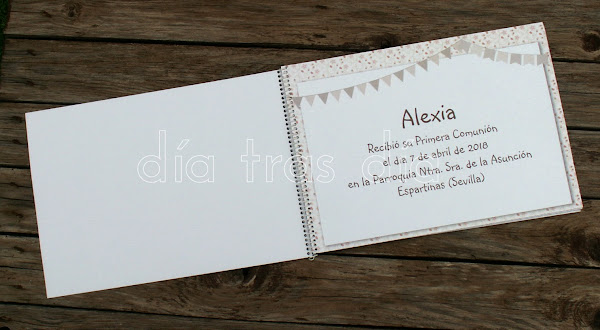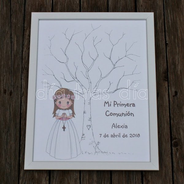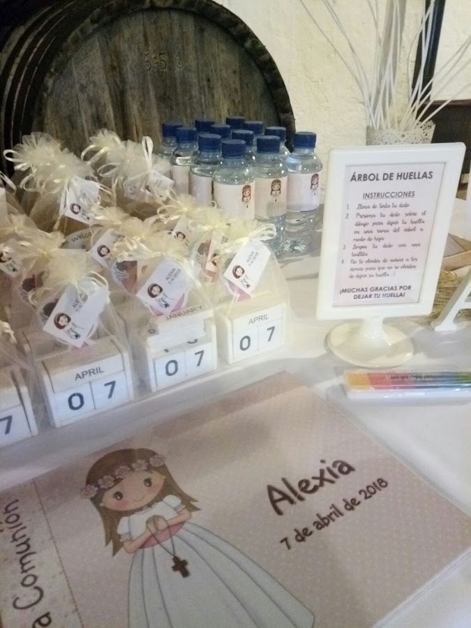 Susana, la mamá de Alexia, se decidió por los recordatorios, el árbol de huellas y el libro de firmas. Al igual que Carmen, Susana eligió una de las niñas del catálogo y escogió el resto de detalles para configurar a su gusto todos estos detalles.