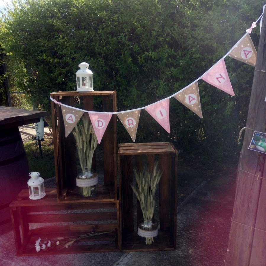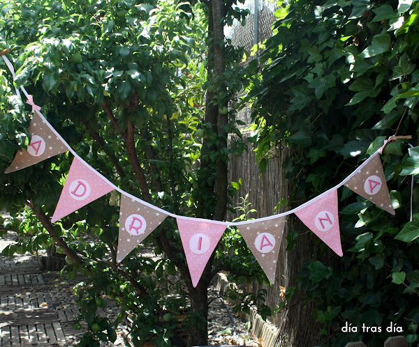 La banderola del año pasado la hice de tela. Pero este año decidimos hacerla a conjunto con el resto de elementos de papelería para poder incluir en ella la misma muñequita y el mismo tipo de letra empleados. Así que se han realizado en un papel grueso, como el que se ha usado para los recordatorios.