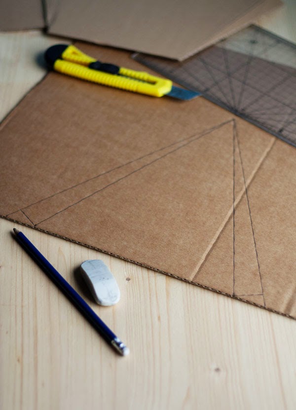 Cortad el cartón con un cúter y marcad el doblez entre los dos triángulos con un corte de cúter que no llegue hasta el fondo del cartón. Plegad los triángulos pequeños hacia atrás y ya lo tendréis.