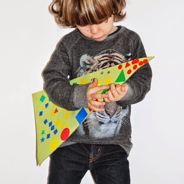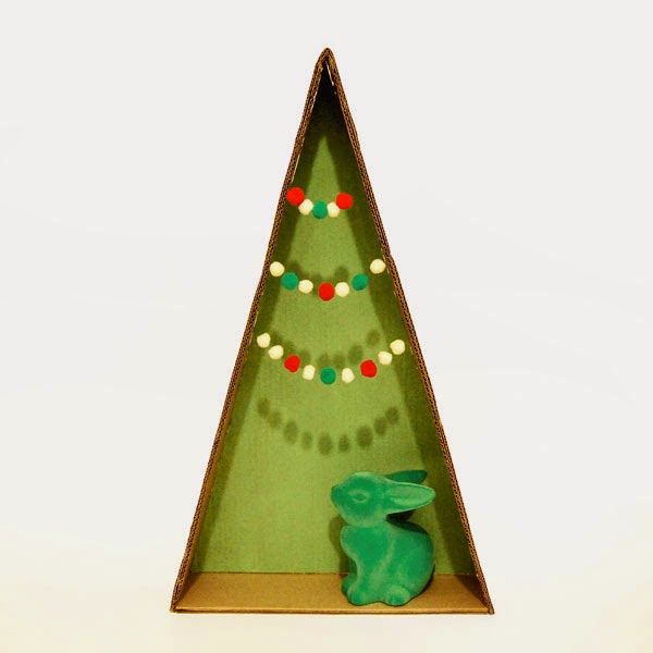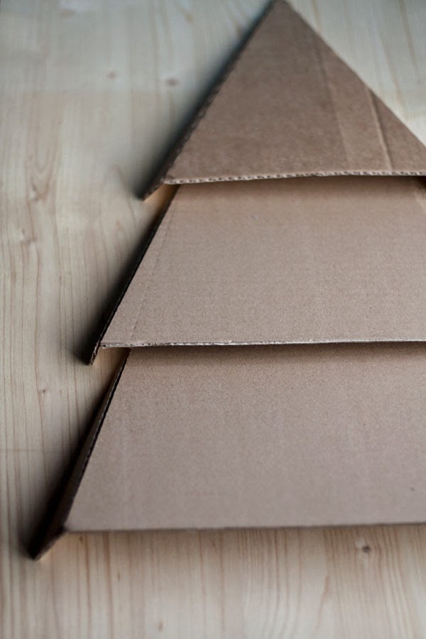 ¿Cómo se hace? Es muy fácil. Solo hay que dibujar tres piezas, dos trapecios y un triángulo, que se solapen, es decir, cuya base sea más grande que el lado superior de la pieza anterior (menos el triángulo, que va arriba de todo y no se esconde en ningún sitio). Dibujáis las piezas sobre cartón y luego les añadís un triángulo más fino a cada lado, como en la foto. Intentad que los triángulos tengan el mismo tamaño en todas las piezas, porque así queda más equilibrado.