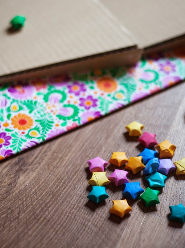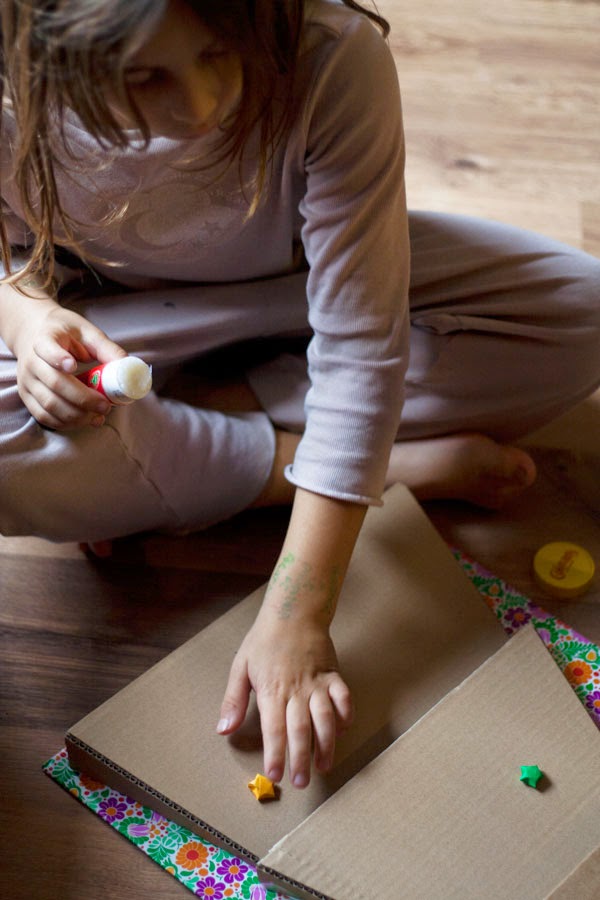 Así que, después de muchas ideas, se nos ocurrió que esta versión con volumen quedaría muy chula y luego nos acordamos de que teníamos un botecito lleno de estrellas de origami y las pegamos con paciencia y cola en barra :)