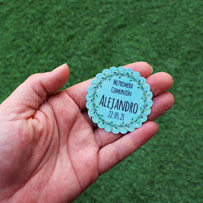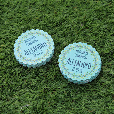 Para poner en los detalles, Carmen también me pidió unas etiquetas circulares con un diseño sencillo, con el nombre del peque y la fecha de la Primera Comunión: