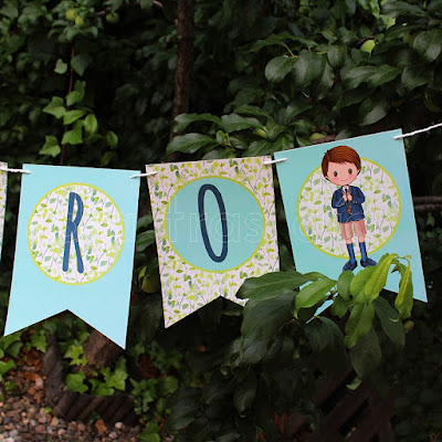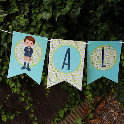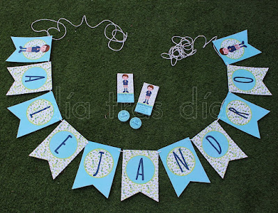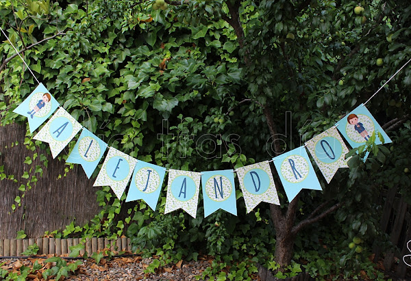 A juego con los recordatorios también preparé una banderola personalizada con su nombre y con el dibujo de Alejandro en los extremos: