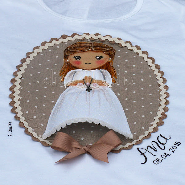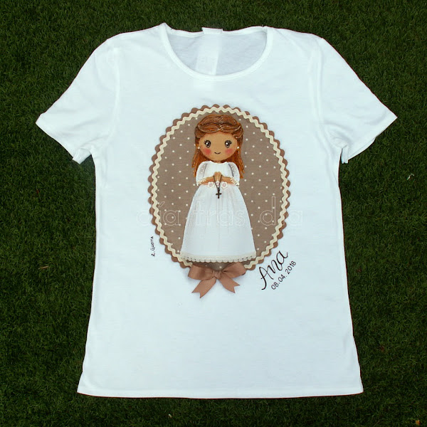 Cuando ya le había entregado esto, me dijo que la abuelade la peque quería regalarle una camiseta personalizada de niña de comunión, así que, como ya sabía perfectamente cómo iba a ir Ana, preparé la camiseta a juego con los recordatorios y el libro. Eligieron el modelo medallón, que tan elegante resulta siempre.
