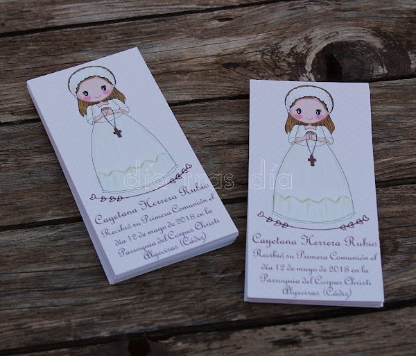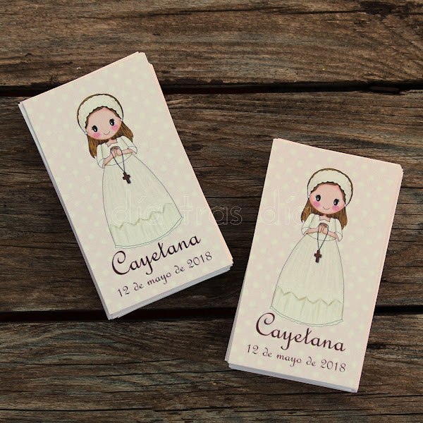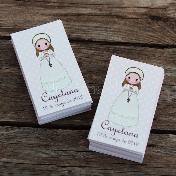 Y para finalizar, os voy a enseñar unas tarjetitasque Marga me pidió que le hiciera para poner en los detallitos que iba a regalar en la celebración. Fueron decoradas con el mismo dibujo personalizado de Cayetana, junto con su nombre y la fecha de la Primera Comunión: