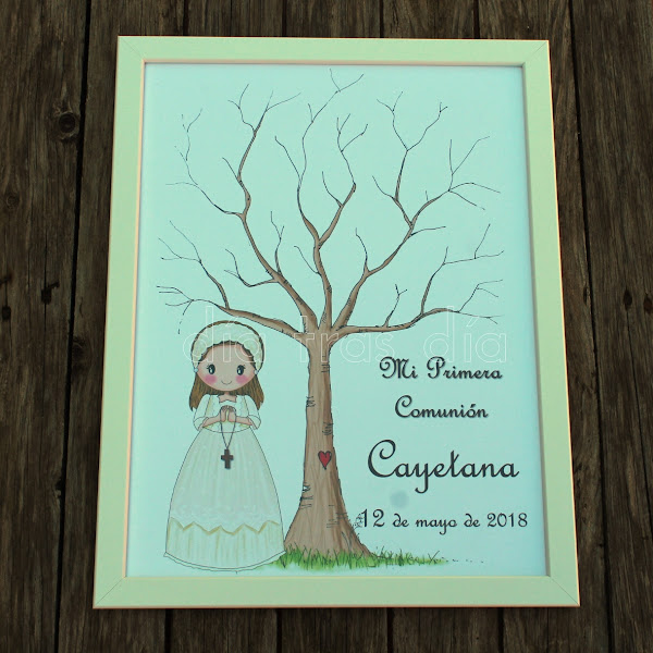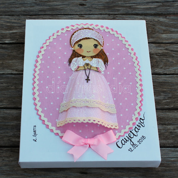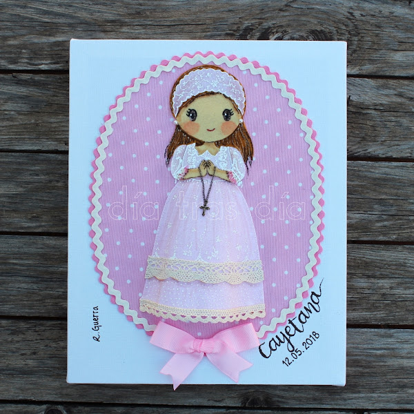 Seguimos con los detalles para Cayetana y ahora le toca el turno al lienzo que preparé con el dibujo de Cayetana de Comunión. Este tipo de lienzos quedan perfectos para decorar la mesa dulce de la celebración si la hay y después queda un recuerdo bonito para colgar en el dormitorio del protagonista.