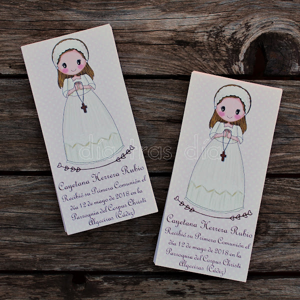 Con las fotos que Marga me envió de Cayetana con su vestido, hice su dibujo personalizado. Y así es como resultaron los recordatorios: