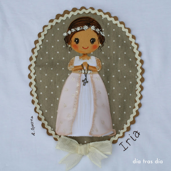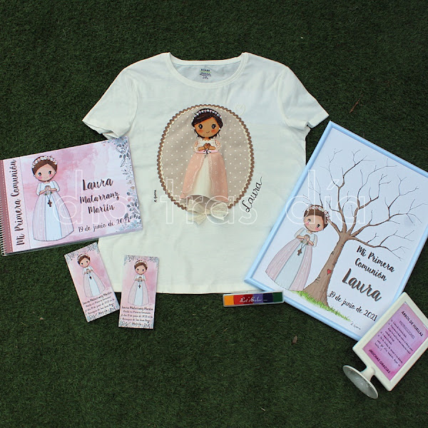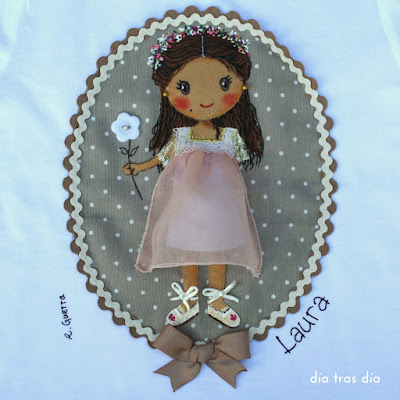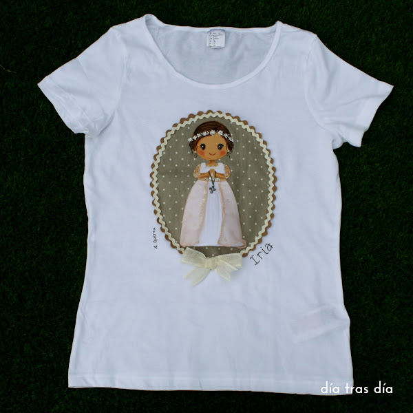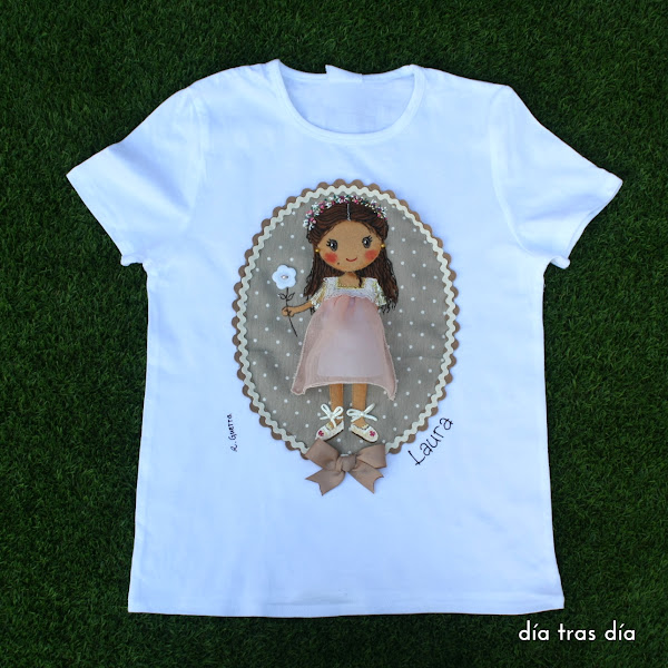 Sonia ya me encargó hace unos años una camiseta de Primera Comunión para Iria, su hija mayor. Y en aquel momento también me pidió una camiseta para Laura, su hija pequeña, vestida con el traje que lució en la comunión de su hermana. Creo que nunca llegué a hacer una entrada en el blog con estas dos camisetas, así que os enseño un par de fotos para que veáis como resultaron: