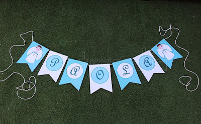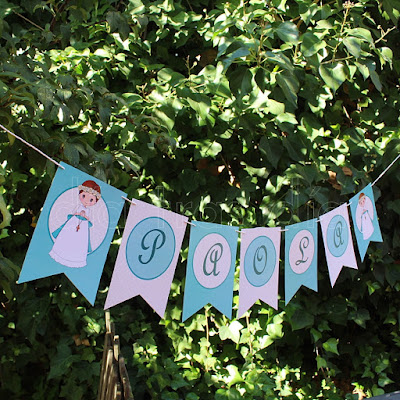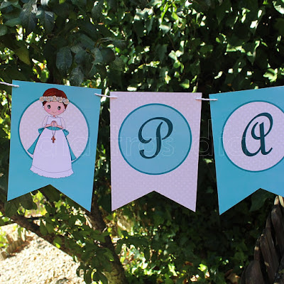 Otra de las cosas que me pidió Rocío fue una banderolacon el nombre de la peque para decorar la mesa dulce en la celebración. Como todo lo anterior, usamos los mismos colores y diseños de fondos y letras: