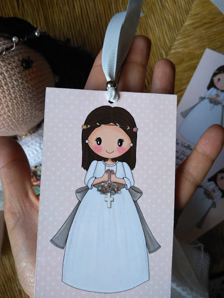 Y ya una vez terminada la Primera Comunión de Paula, Elena me envió una foto para que viese como quedaron los recordatorios con sus lacitos puestos: