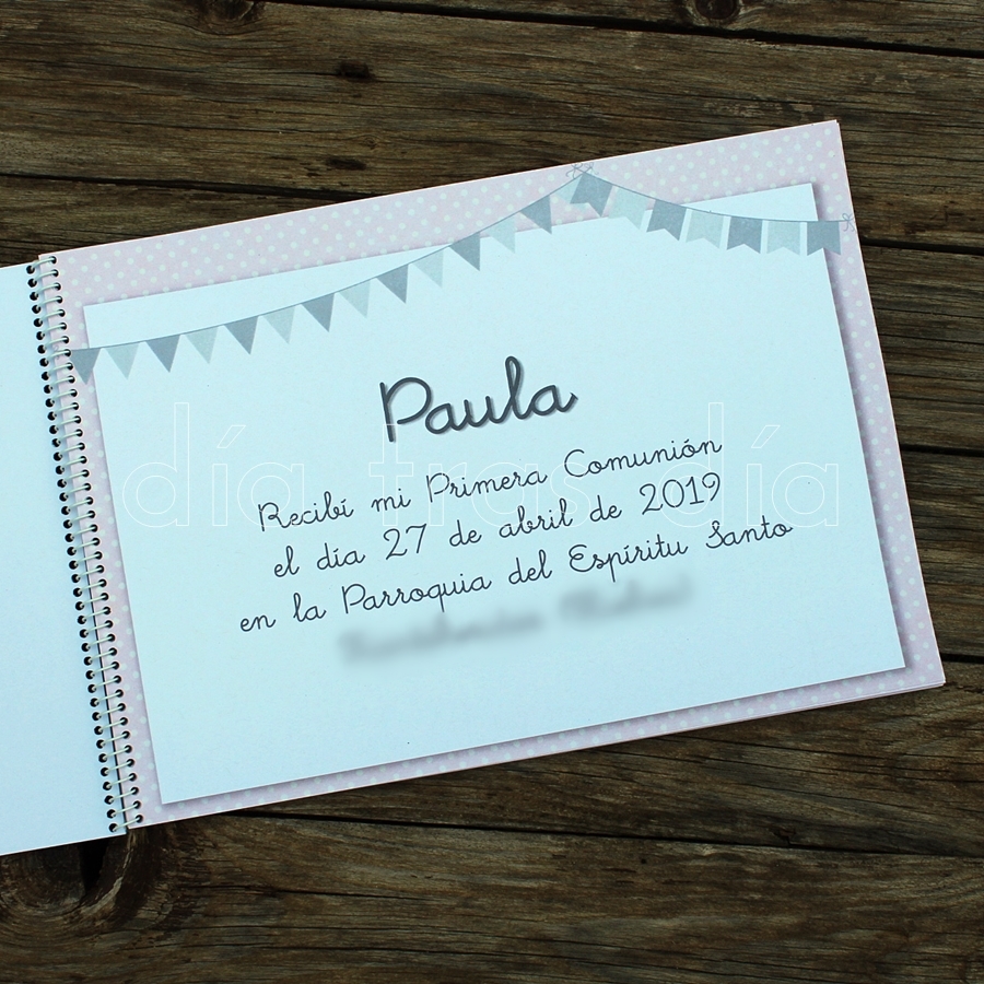 Como es decía, Elena ha estado este pasado sábado celebrando la Primera Comunión de Paula. Y para este evento, quiso contar conmigo para que le hiciera los recordatorios y libro de firmas personalizados.
