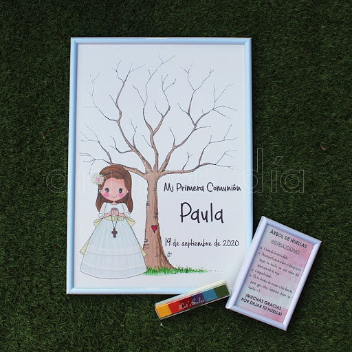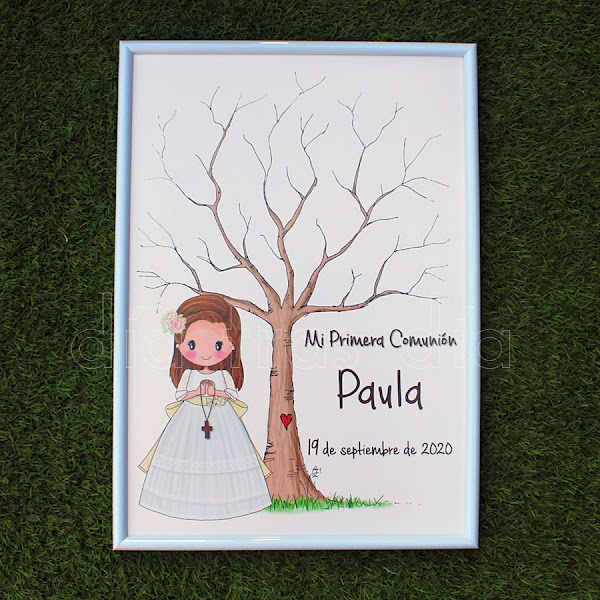 En primer lugar, os traigo para que veáis el árbol de huellas de Paula. En esta ocasión, la mamá de Paula eligió del catálogo uno de los dibujos que ya tenía yo preparados y que más se asemejaba a cómo iba a ir vestida Paula: