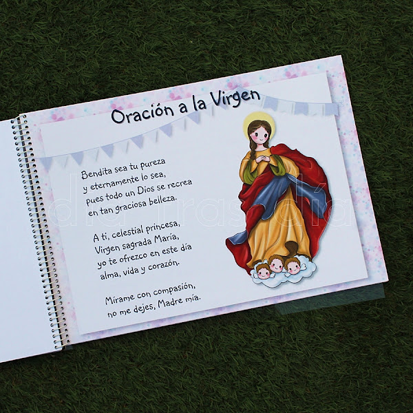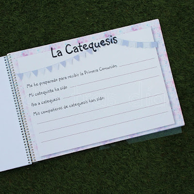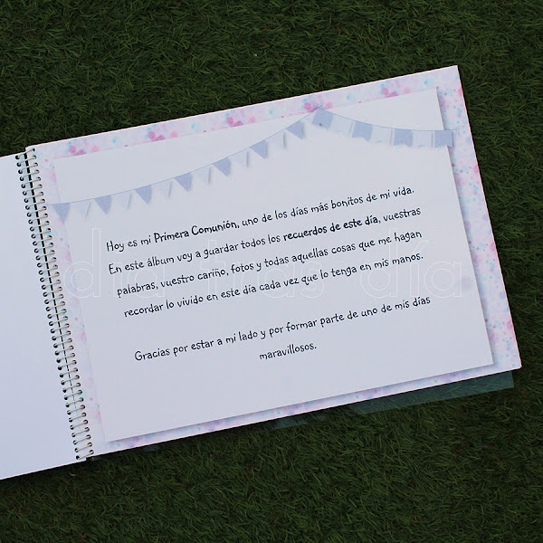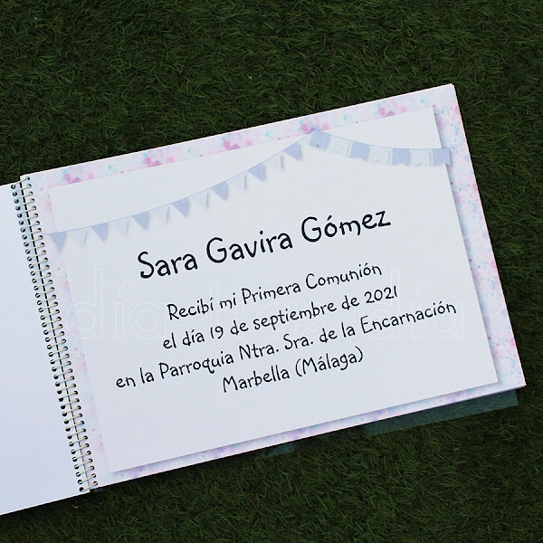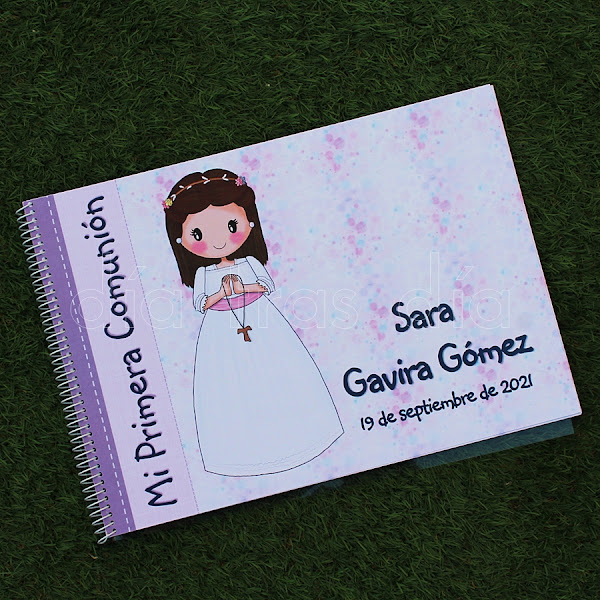 Patricia, la mamá de Sara, se puso en contacto conmigo para que le preparase un par de detalles para este día. En primer lugar me pidió que le hiciera un libro de firmas, para el que eligió uno de los dibujos ya preparados del catálogo de Comunión de Día tras Día. En cualquier caso, a pesar de que el dibujo no fuese personalizado, su libro fue preparado especialmente para ella, con los fondos y tipografías que ellas eligieron y con los textos personalizados, con su nombre y los datos de la celebración.