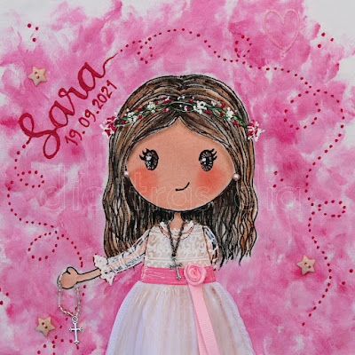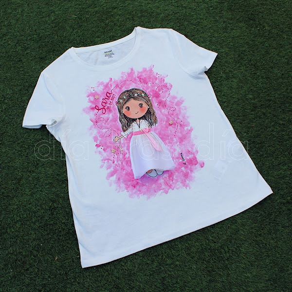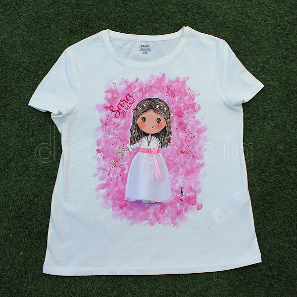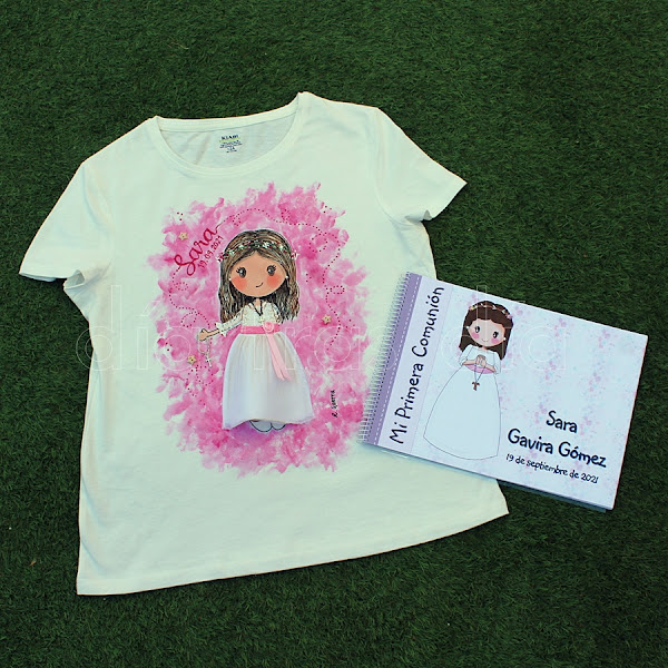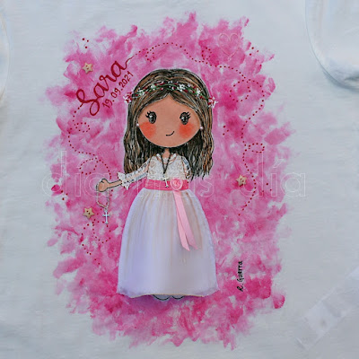 Y, además del libro, Patricia también me encargó una camiseta personalizada de Primera Comunión. En este caso, el dibujo de la camiseta sí fue totalmente personalizado, con el vestido y peinado como los que Sara luciría en su día. A partir de las fotos que Patricia me envió, así es como preparé la camiseta para su peque: