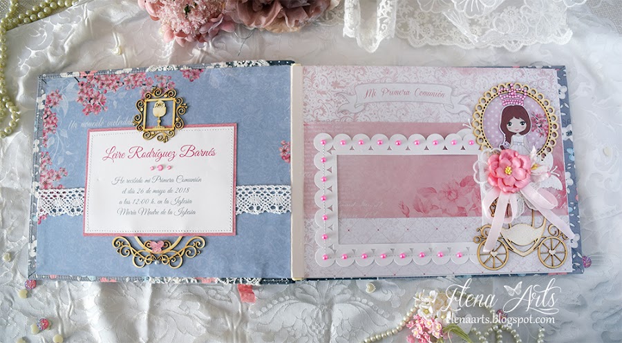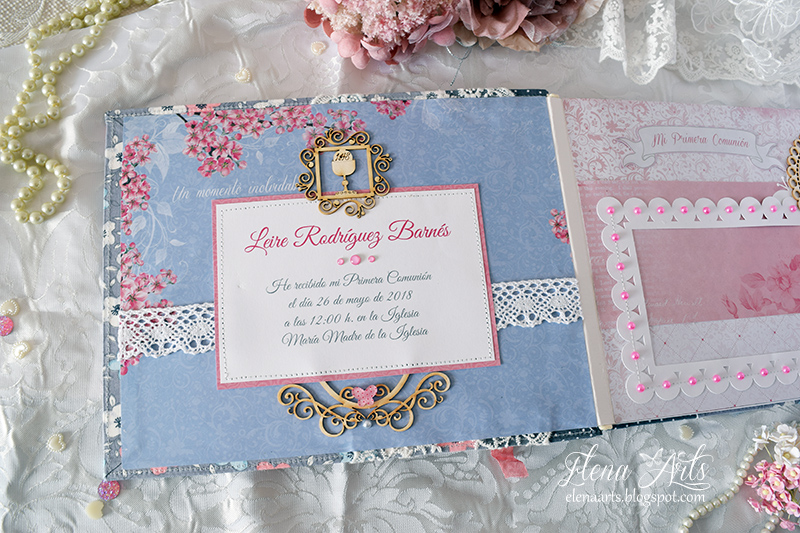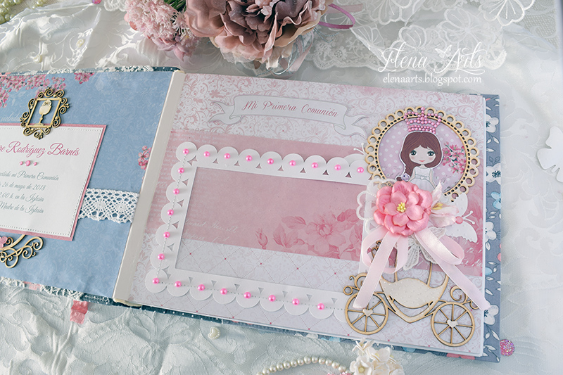 La primera página lleva un marco adornado con perlitas rosas y cosido por sus tres lados. la foto de la niña se insertará desde arriba.