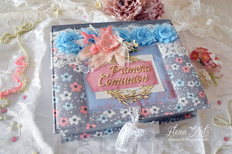 La caja a juego ha quedado preciosa, con esta tira de flores de tela azules y una rosa de seda de color rosa.