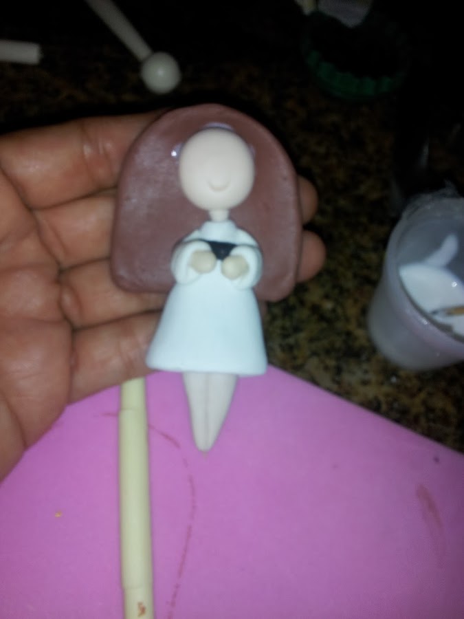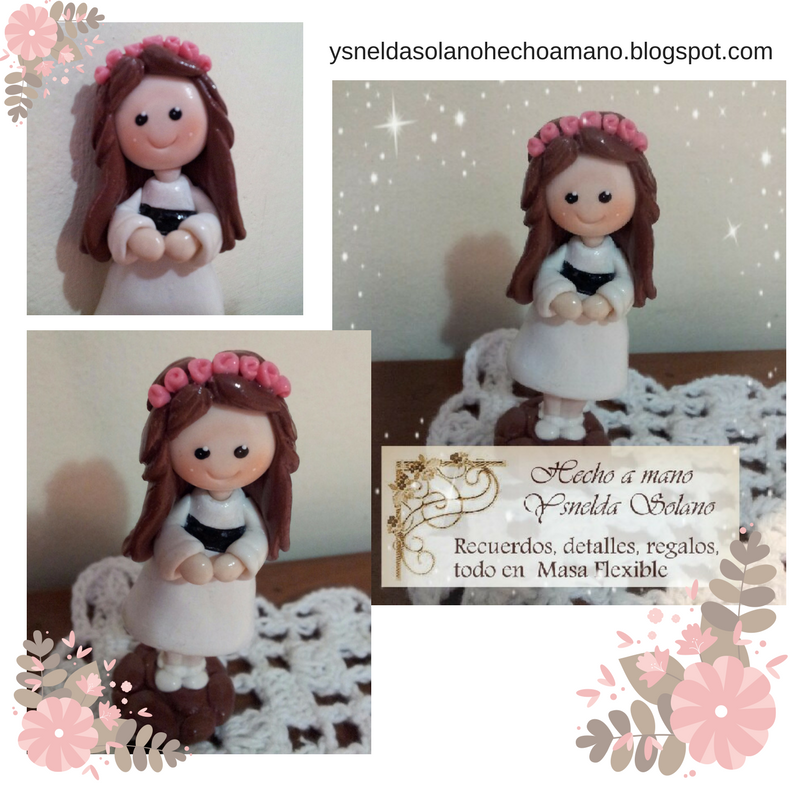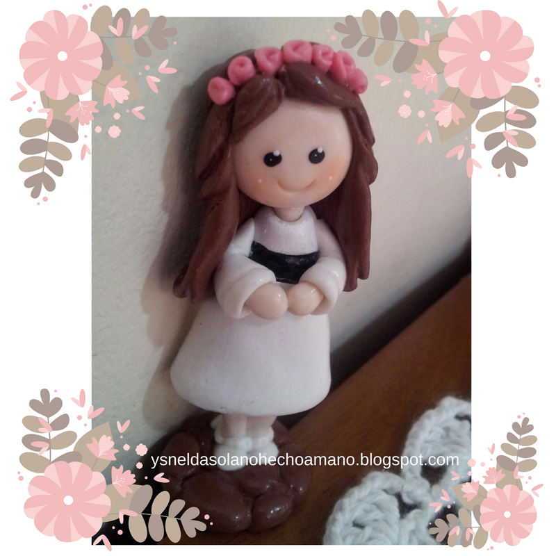 La forma en que realicé esta pequeñita, con su vestido color blanco, su cinto negro, su hermosa y abundante cabellera y sus rositas formando un lindo cintillo en su cabello, se los muestro a través de una serie de fotografías que fui tomando en el transcurso del proceso de realización.
