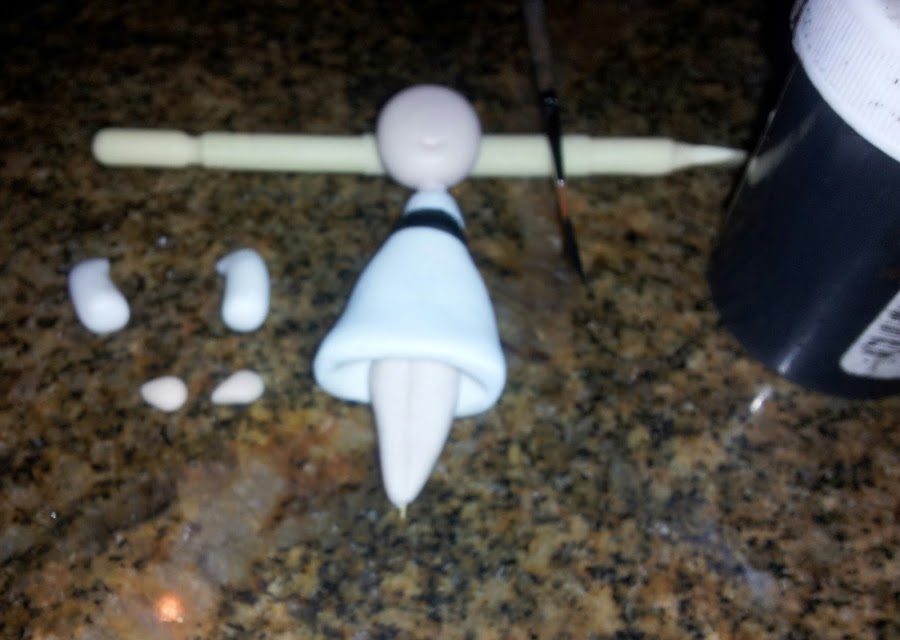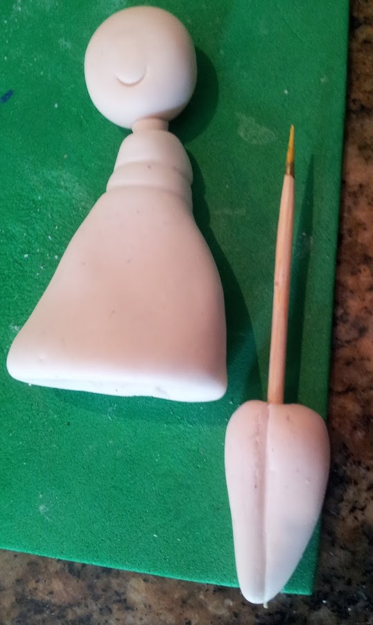 Las piernas, son dos rollitos de masa, que uní a cada lado del palillito de dientes, también podría ser un alambre (que sirve de soporte de la pieza).
