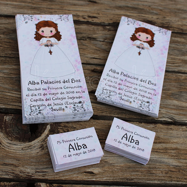 Pues así es como resultaron finalmente los recordatorios de estos dos peques, tras la elección de todos los detalles (colores y tipo de fondos, tipografías, vestidos…) para que resultaran totalmente a su gusto:
