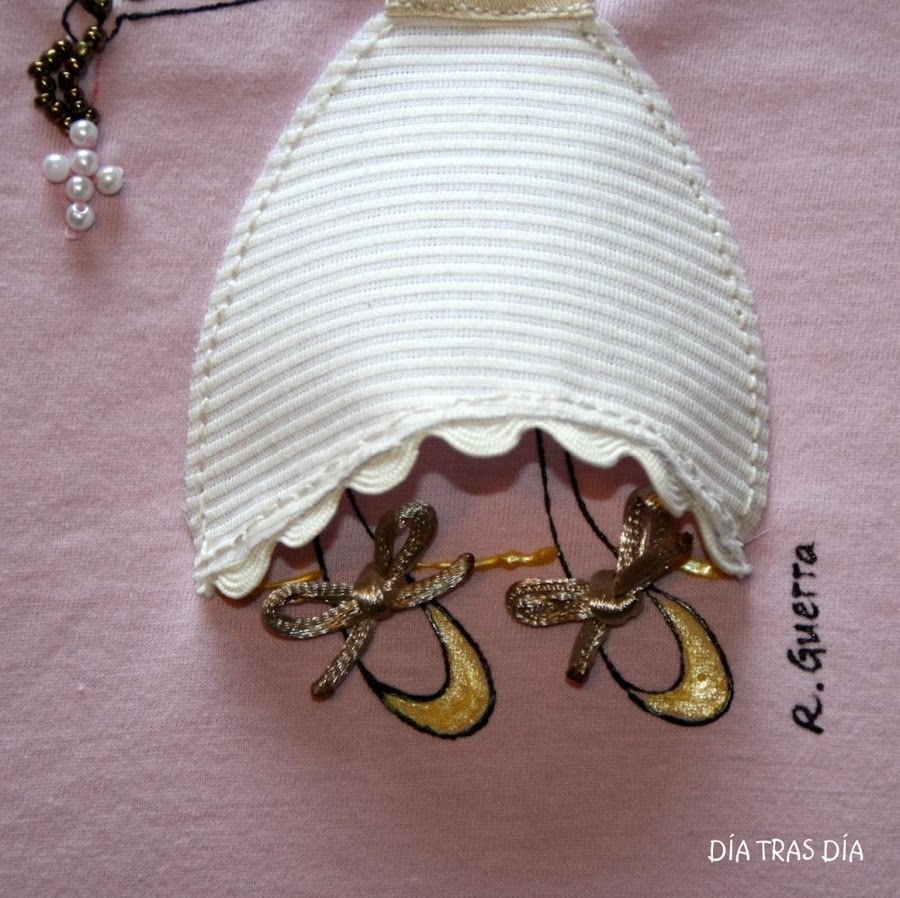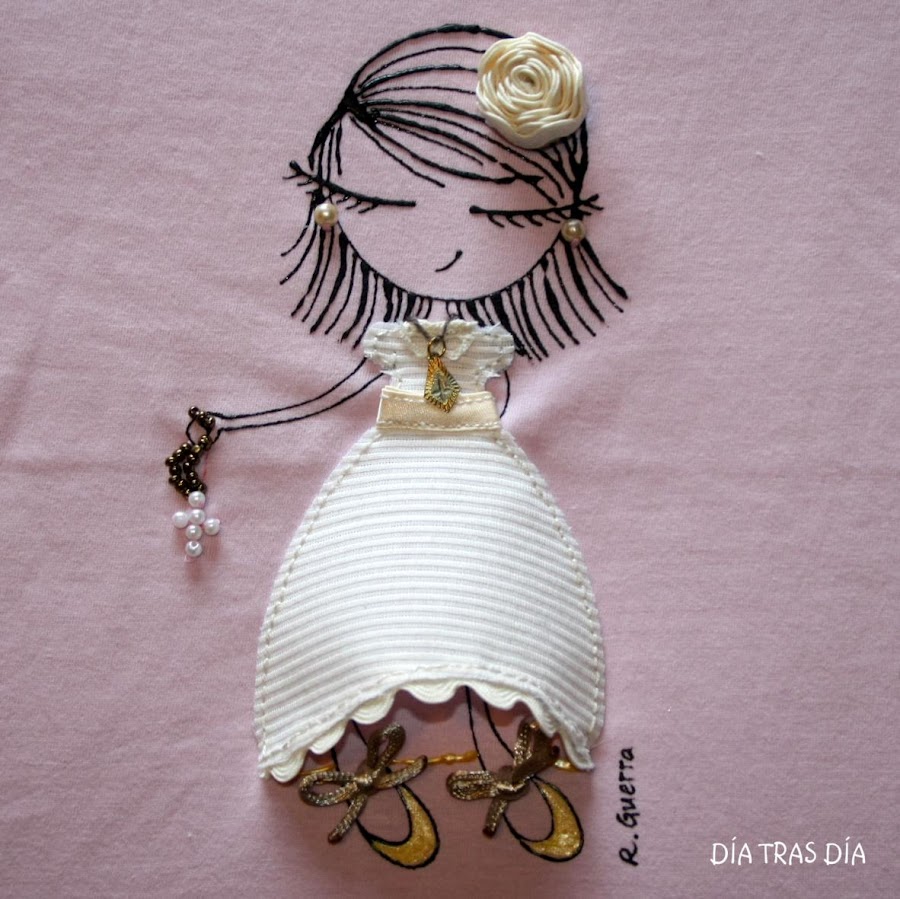 Hace unos días, llevé una camiseta que me habían encargado en una tienda. Y hablando un poco de todo, su dueña me dijo que se le había ocurrido una idea. Pensando ya en que se aproximan las fechas de las Primeras Comuniones, me planteó el hacer una camiseta con una niña vestida de 1ª Comunión, para exponerla allí en la tienda, como idea para regalar a las protagonistas de ese día. Ella lo había pensado como un regalo para hacer a la peque que hace su Primera Comunión para que se ponga en cualquier momento de la posterior celebración sin que pierda ni una pizca de glamour ;-). La verdad es que yo no me lo había planteado, pero decidí que por probar no perdíamos nada.