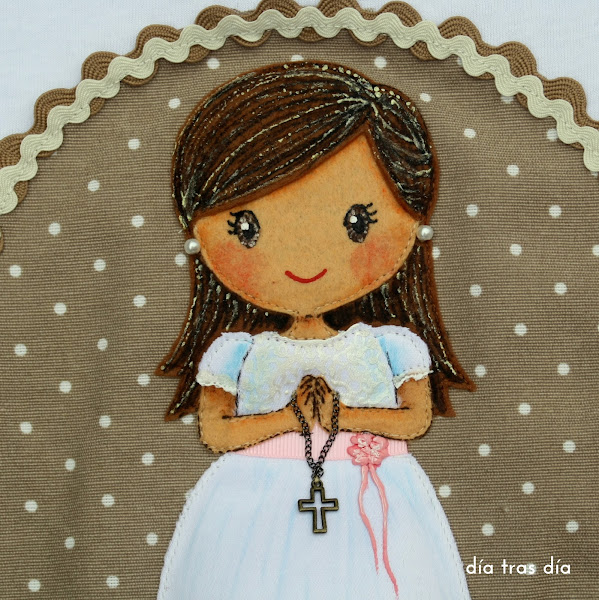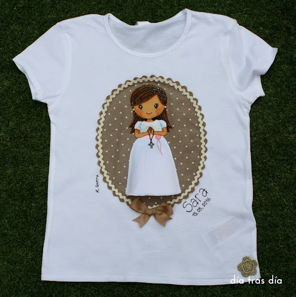 Pues a raíz de haberme pedido Mamen estas dos camisetas, al comentarle la anécdota a la madre de Lucía, ella me escribió para decirme que me iba a enviar alguna foto para que viese cómo sería el tocado que iba a lucir. Y también ya aprovechó para encargarme dos camisetas de Primera Comunión para dos amigas de Lucía que también la iban a celebrar en estos días.