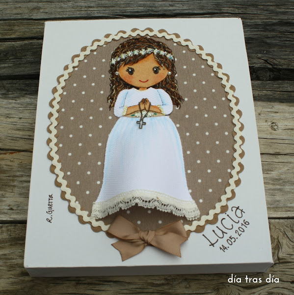 Ya con anterioridad al encargo de Mamen, yo había pensado hacerle a Lucía un lienzo con niña de Primera Comunióncomo regalo. Así que al decirme su tía que quería hacerle la camiseta, le comenté que yo le iba a hacer el cuadro y que los haría iguales para que fuesen a conjunto nuestros regalos. De esta forma Lucía tendría su camiseta que podría lucir el mismo día de la Comunión y después tendría el lienzo para decorar su dormitorio como recuerdo de este bonito día.