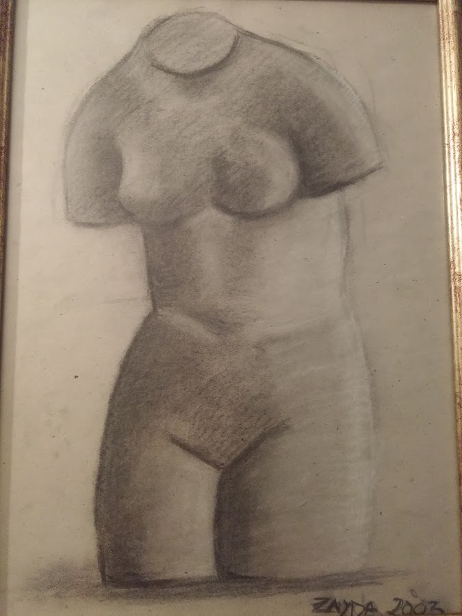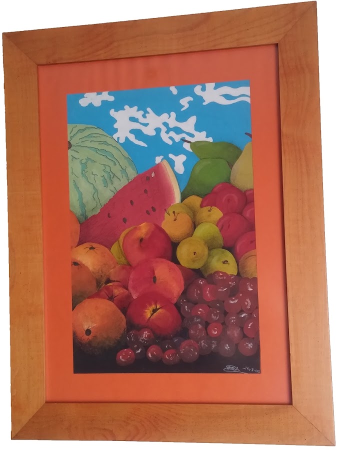 Realizado con acuarela y lapices de color. Es anterior a los cuadros en carboncillo. Curiosamente lo extraje de una publicidad de una frutería, de ahí que el fondo sea un cielo azul, me limité a realizar una copia lo mas parecida posible a la realidad.