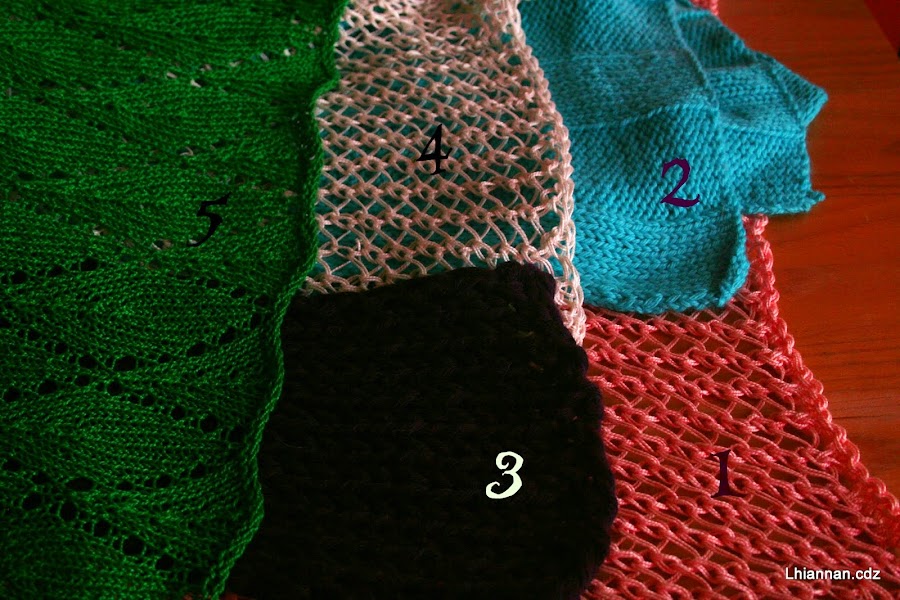 1.- En algodón color salmón, trabajado con hebra doble de hilo del número 5 y agujas muy gordas; el punto es sumamente sencillo porque todas las vueltas se trabajan igual. Es ancho para ser usado como chal.2.- En lana merino de color turquesa, trabajado en canalé 9/9. Me gusta que este tipo de prenda se vean igual por el revés y por el derecho; no siempre es posible, claro. Es una bufanda bastante ancha.