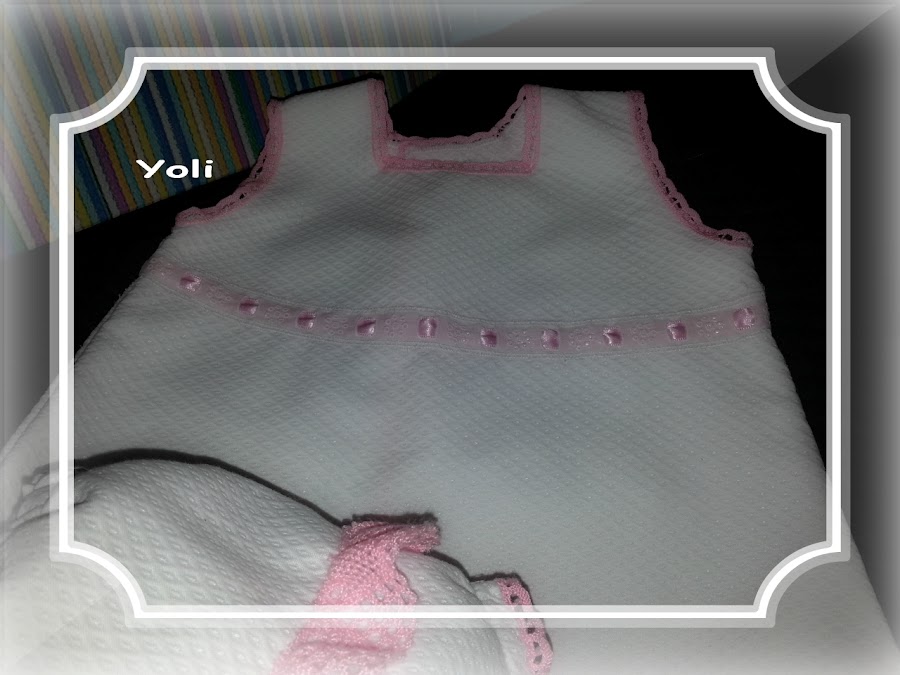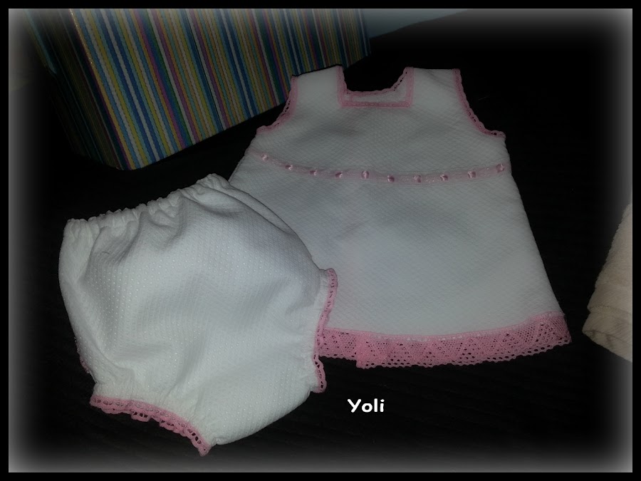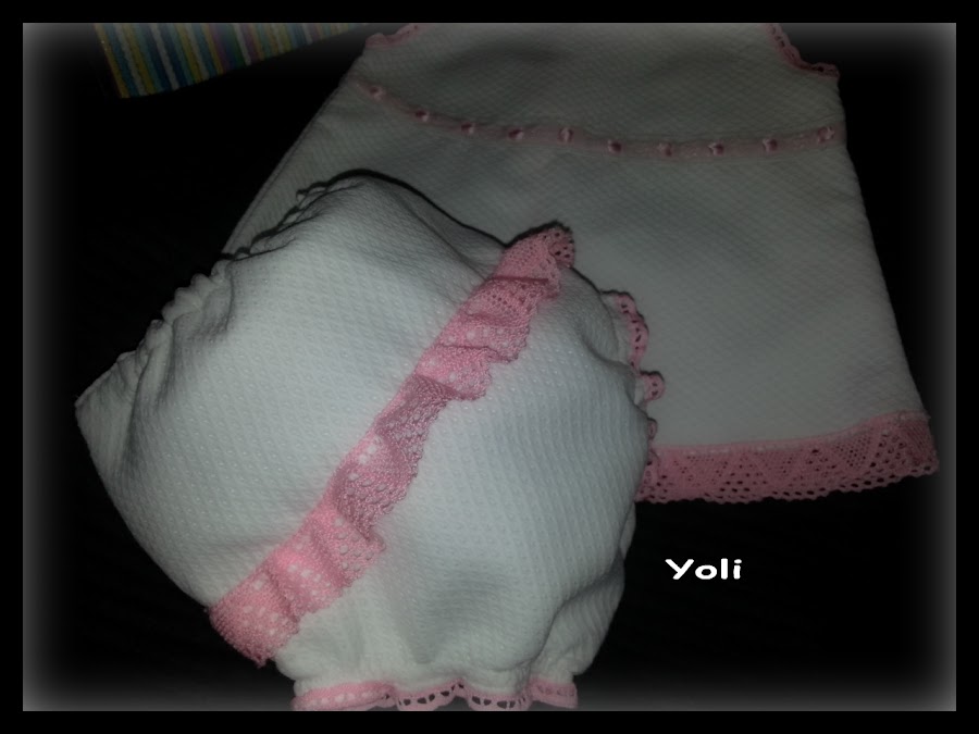 La hicimos un conjunto para el verano jesusito y braguita en piqué blanco adornado con puntillas y entredoses en rosa.
