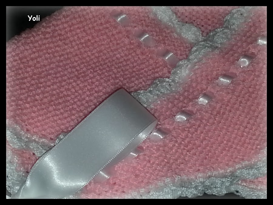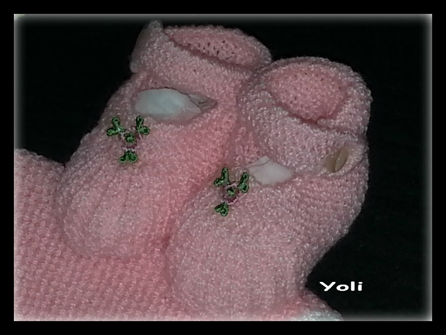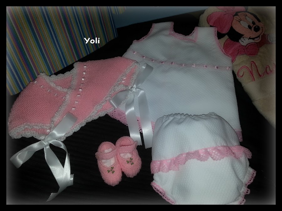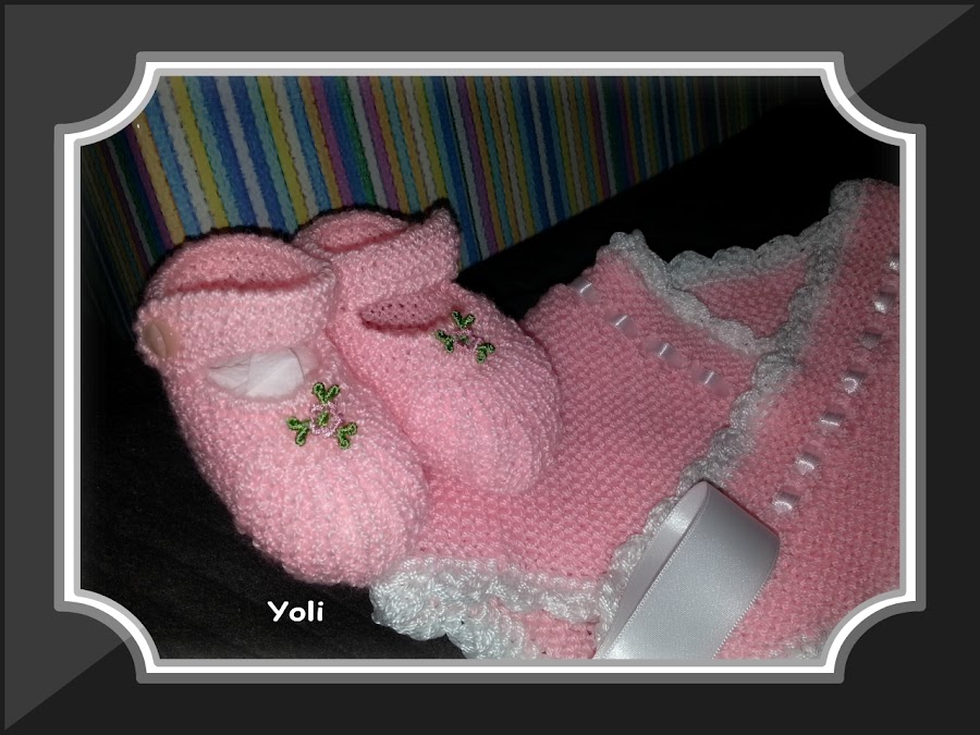Ademas decidí conjuntárlo con la clásica toquillita cruzada para los días fresquitos, y unas mercedítas para que luciera bien "coqueta"...las dos prendas son realizadas en perle rosa al tono de las puntillas y adornadas con lazos y ganchillo en blanco.