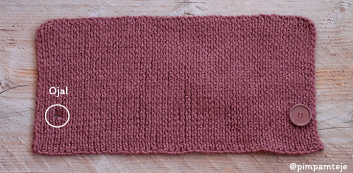 Se trata de tejer una pieza rectangular con un ojal en un extremo y un botón en el otro.