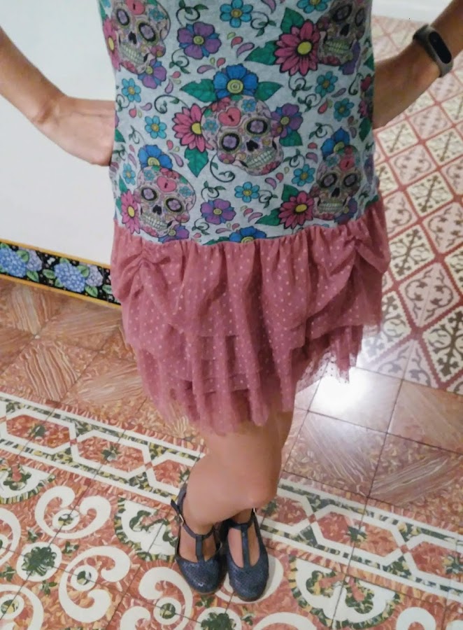 Esta vez la falda no la he hecho de la misma tela de las calaveras porque transparentaba un poco, compré en Cal Joan una tela de camiseta color rosa palo y así hice la parte de arriba mas corta y la cosí directamente a la vez que el plumeti.