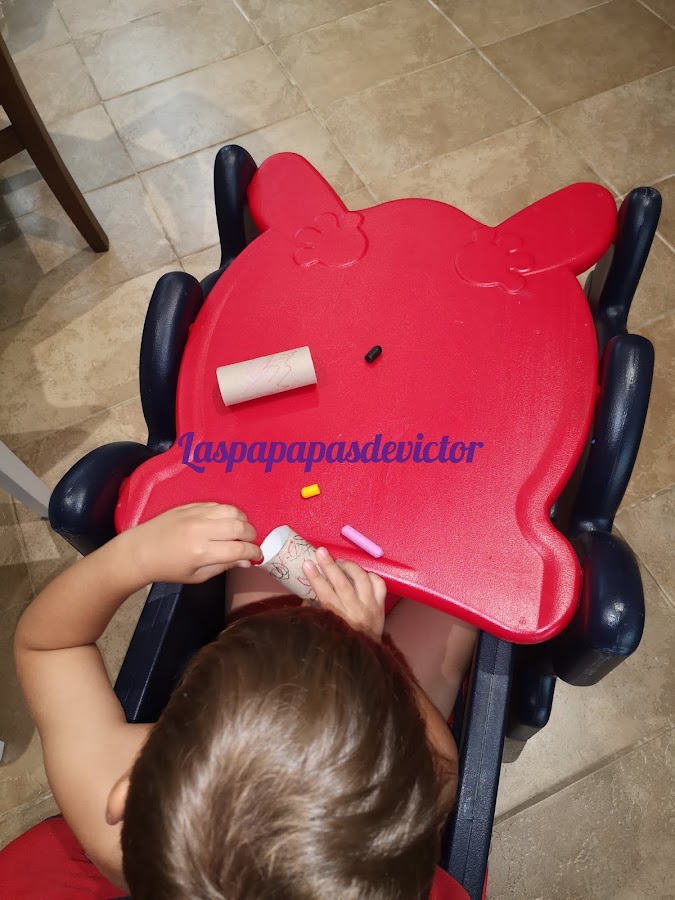 Con un papel de periódico para no manchar la mesa pintamos con cuidado y al gusto del niño los rollos de papel
