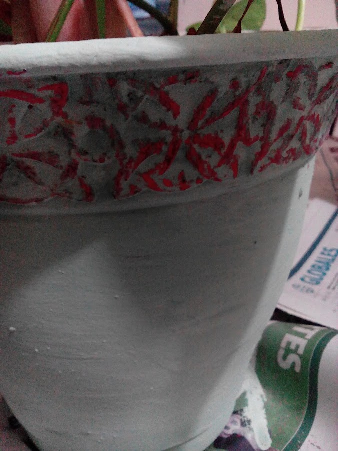 Cada macetero tenia unos diseños en relieve que aproveché, pinté con una de las barras de pastel color rojo superficialmente sin mucho detalles solo para resaltar un poco la obra.