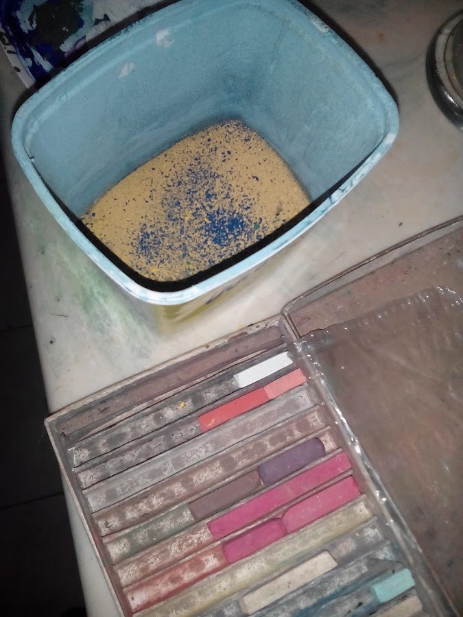 Utilicé barras de pasteles en vez de tiza, lo que tenía a mano con Fe en obtener el mismo resultado, jeje. Para pulverizar las barras no se me ocurrió otra cosa que tomar un guayo de cocina y por los orificios pequeños hice polvo cada barra del color elegido, una color amarillo, una color verde, una color azul.