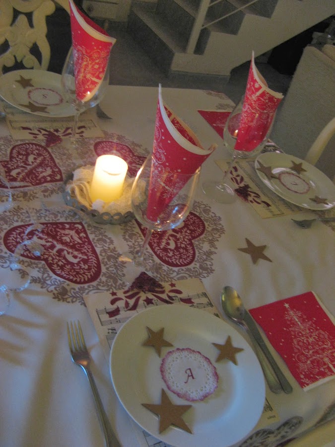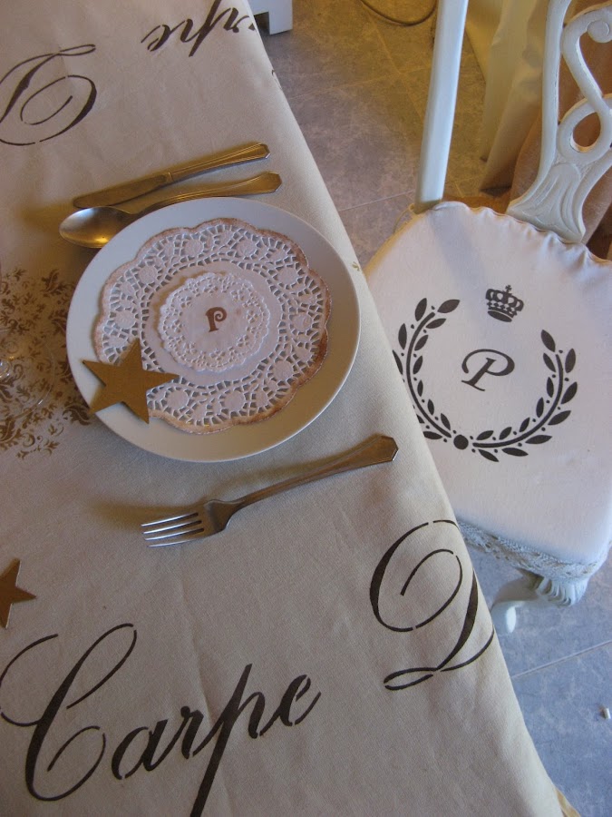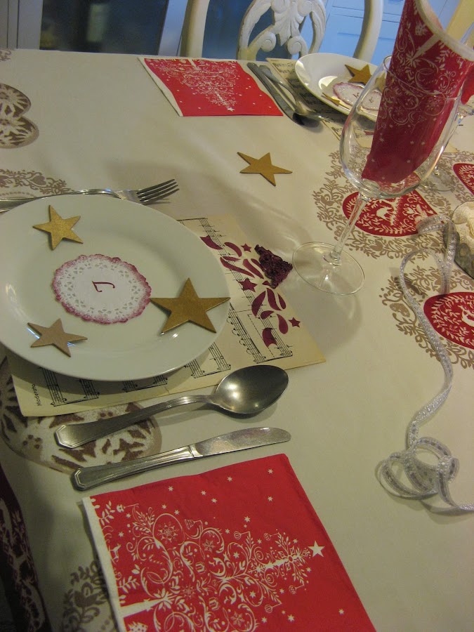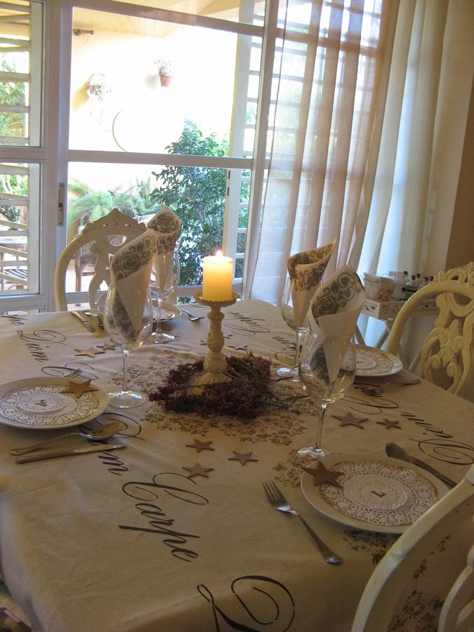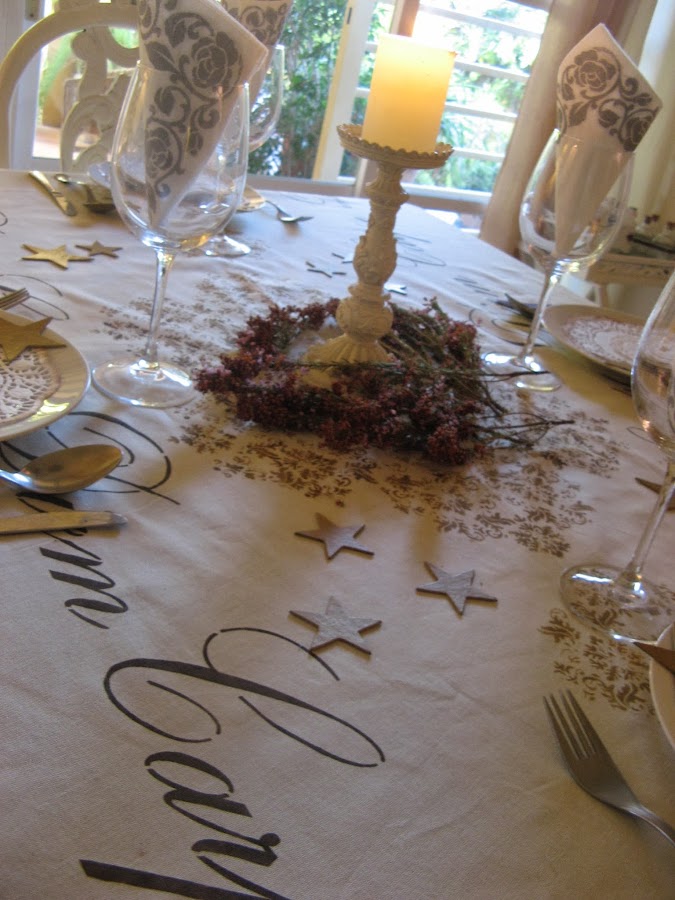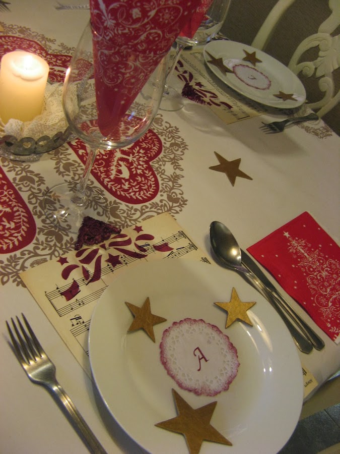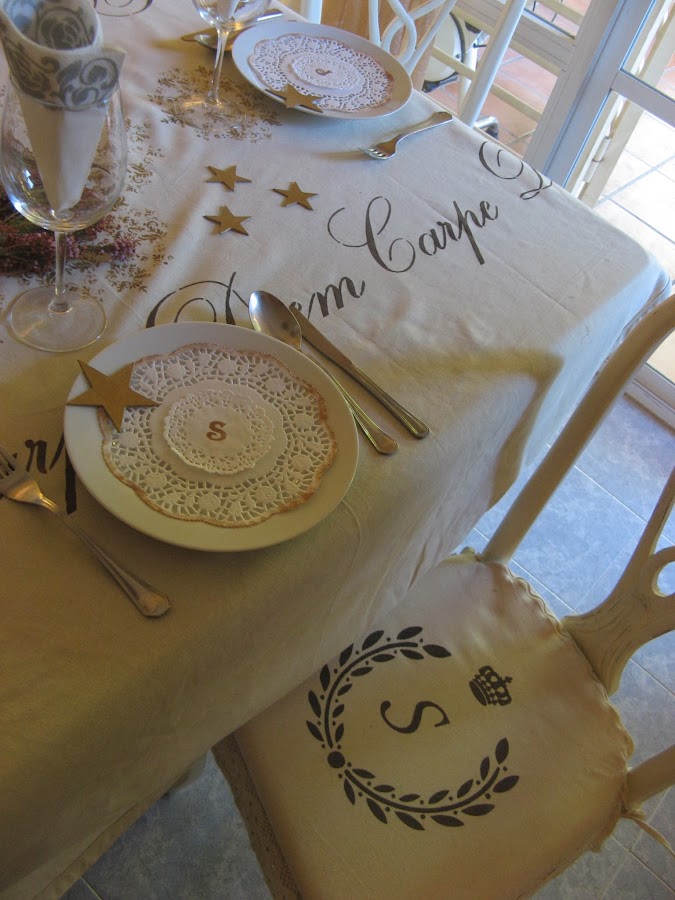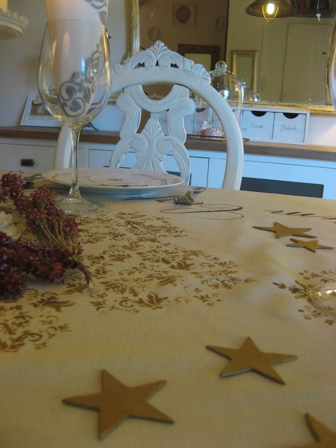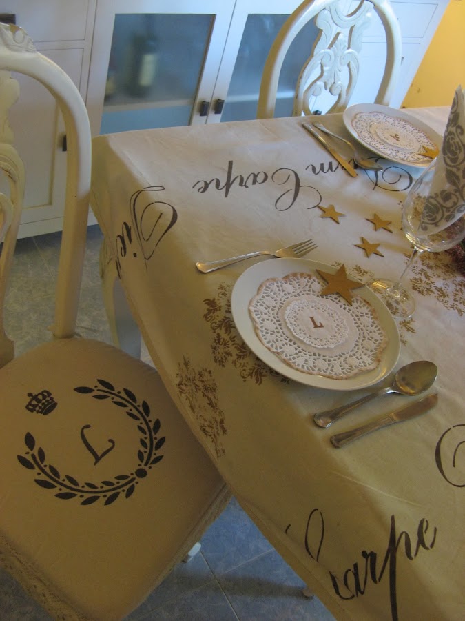 Les he hecho unos estarcidos con unas plantillas navideñas....al final la del ángel que veis en la foto no la he puesto en la mesa porque quedaba muy recargado.....