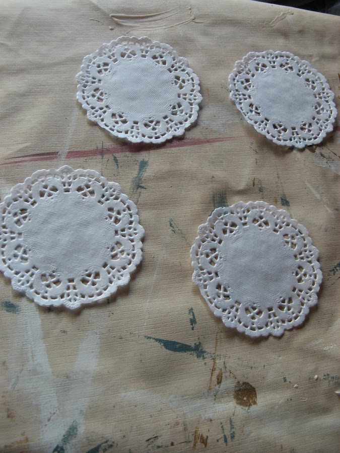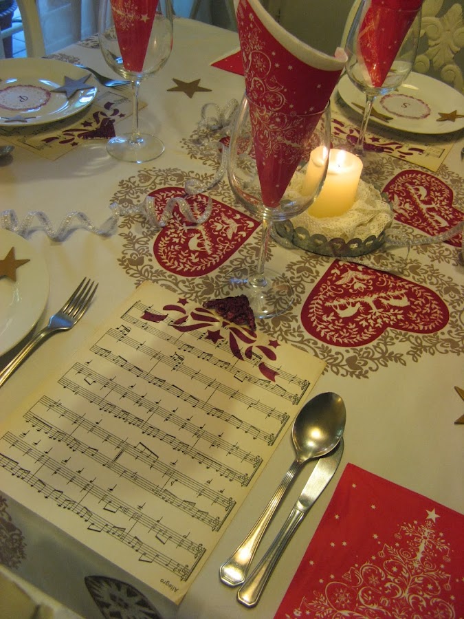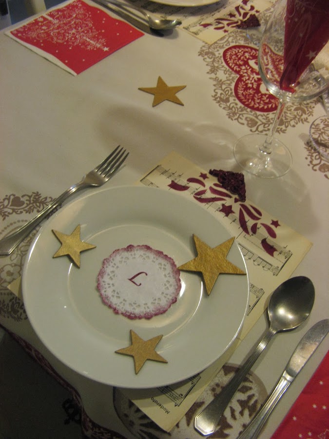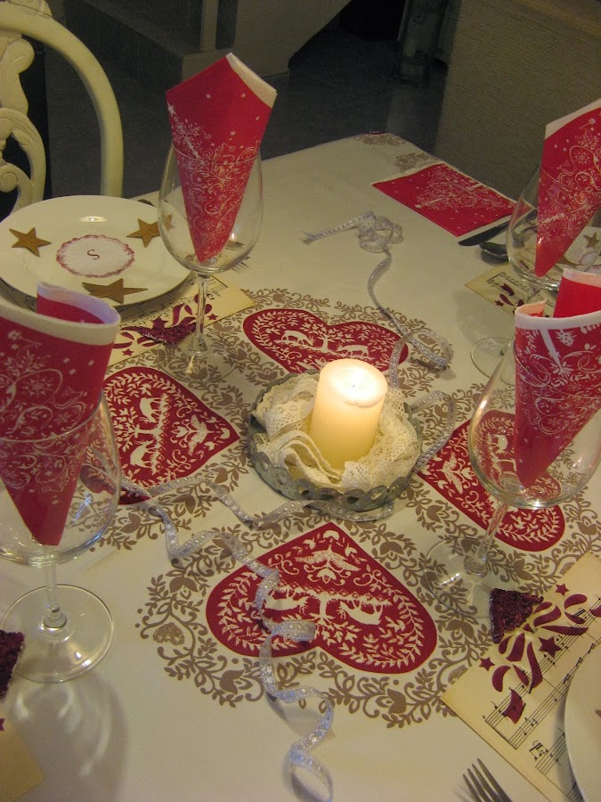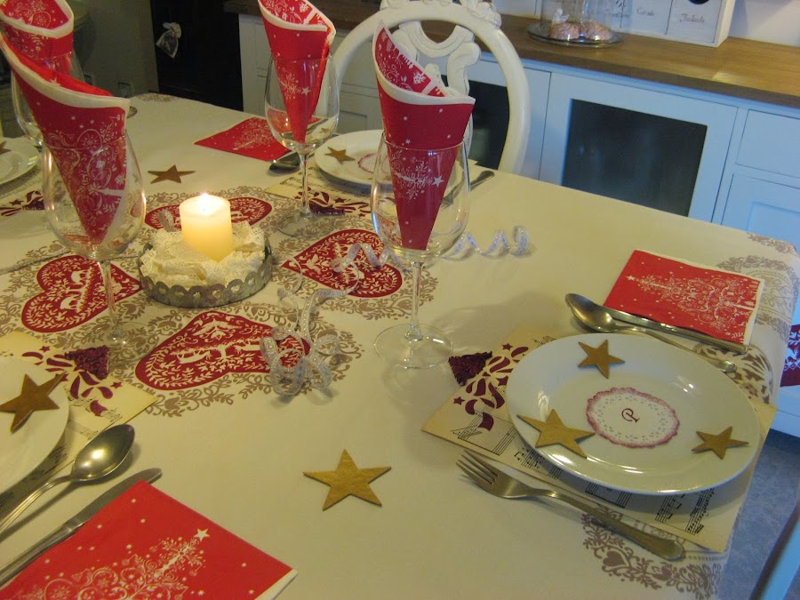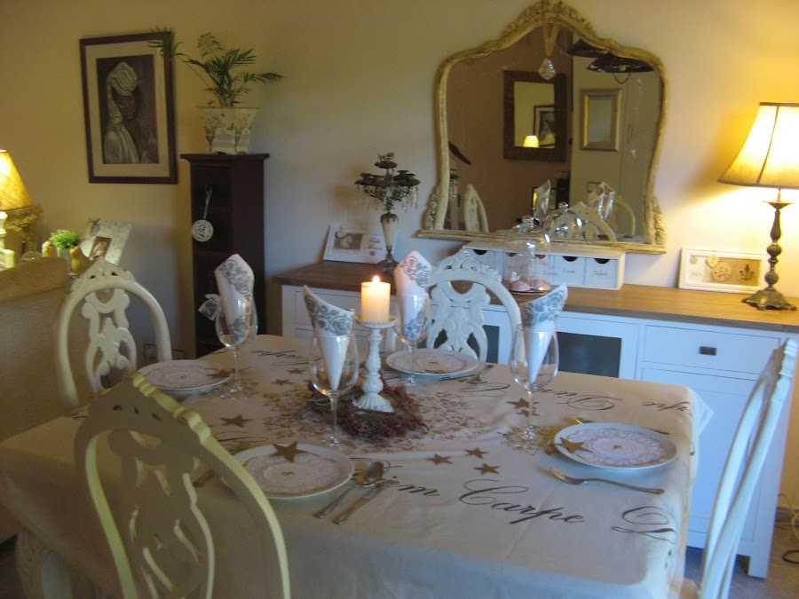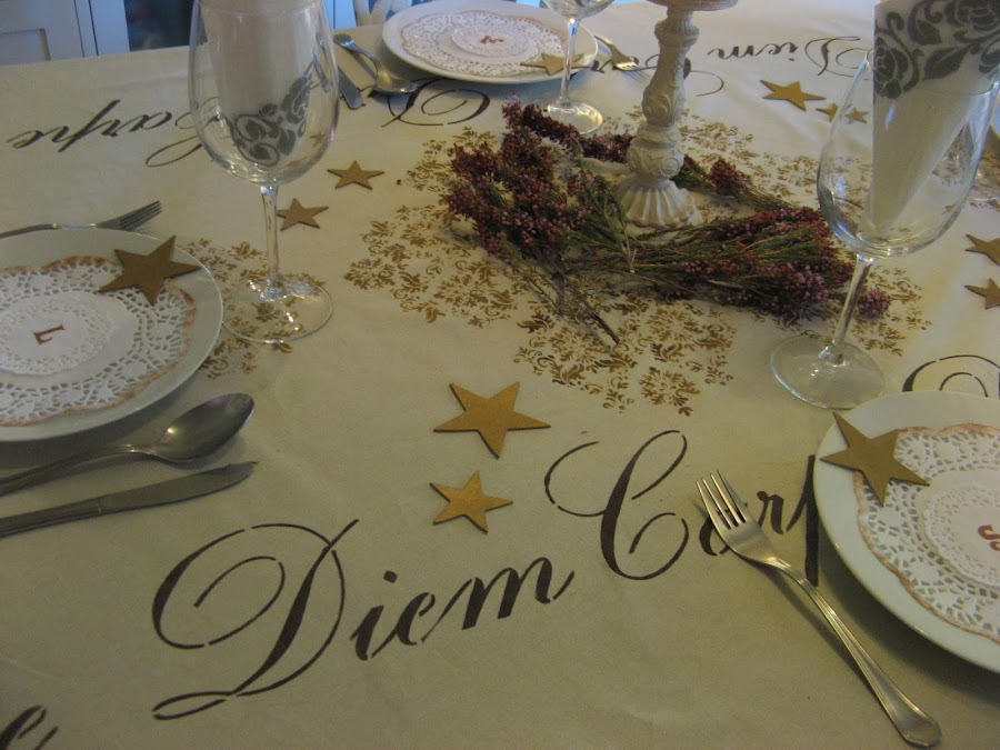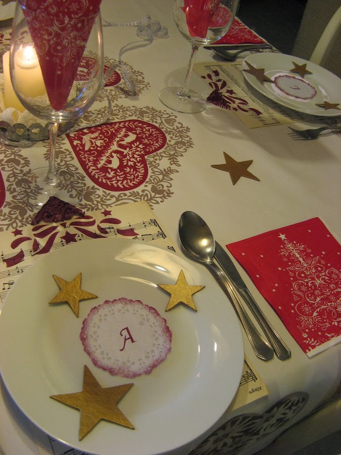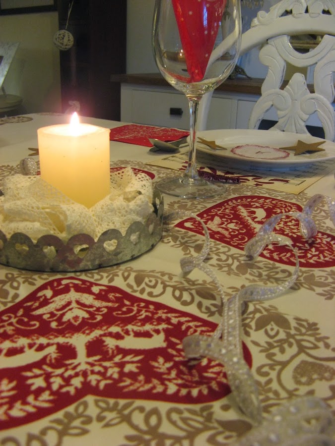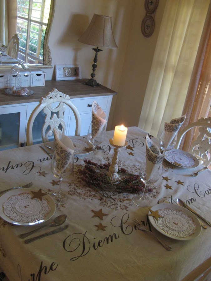 Les he hecho unos estarcidos con unas plantillas navideñas....al final la del ángel que veis en la foto no la he puesto en la mesa porque quedaba muy recargado.....