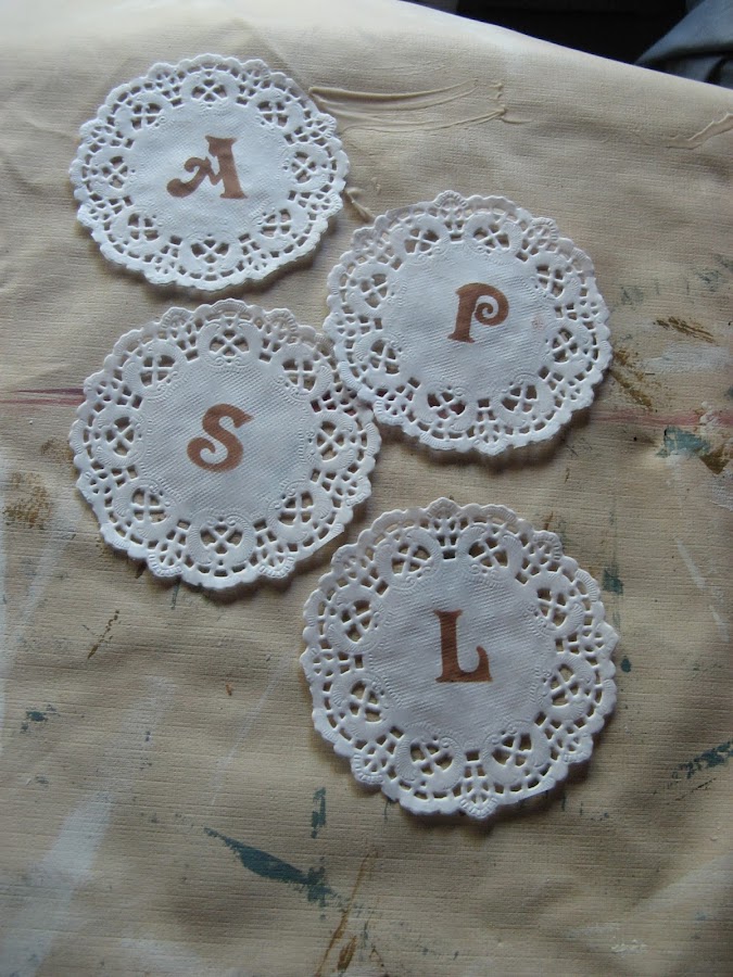 He puesto sobre los platos una blonda grande sombreada en los bordes en color tostado. Dentro unas blondas pequeñitas con nuestras iniciales