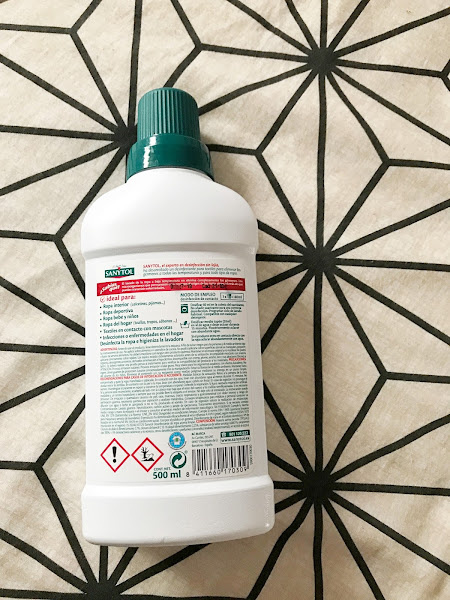 Sanytol desinfectante textil es un producto líquido que se puede usar en la lavadora o en lavado a mano y que elimina los malos olores de la ropa que son causados por las bacterias. En la lavadora, sustituye al suavizante, es decir, se vierte en la cajetilla del suavizante y se deja que la lavadora haga el programa de lavado habitual. Lo he estado probando sobre todo con la ropa del trabajo del Sr. Manías, la ropa sudada de deporte, la ropa de la peque que se mancha mucho de comida y los trapos de cocina. Y de verdad que deja la ropa suave, limpia y con un olor muy agradable.