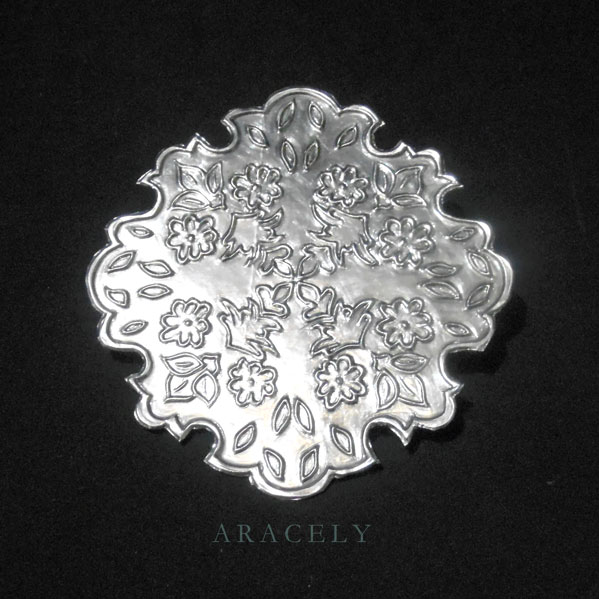 Hoy les muestro una bandeja de trupán o MDF, con un bello repujado en aluminio. Bandeja con repujado de flores circulares Un marco de flores, unidas a una circunferencia, esta lleno de detalles, esta bandeja es grande aproximadamente 38 cm. de largo. Esta es una de las flores en detalle, cada uno esta calado, formando una especie de flecos triangulares a su alrededor, como podrán ver. En la pa ...