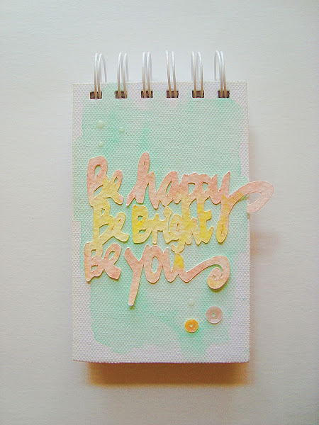Para las tapas he utilizado tela de lienzo y con los Neocolors II (tres colores en concreto: menta, salmón y amarillo) he manchado la portada y pintado el troquel de Wilna Fustemberg que dice: "Se feliz, se brillante, se tú".