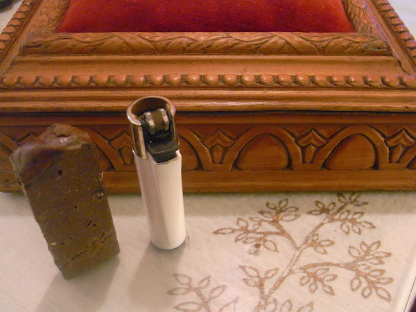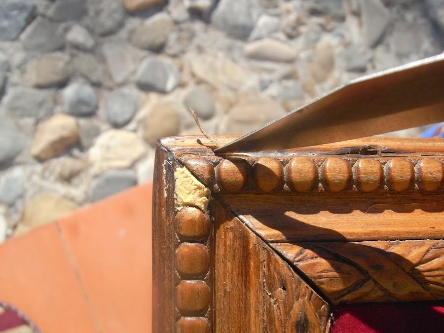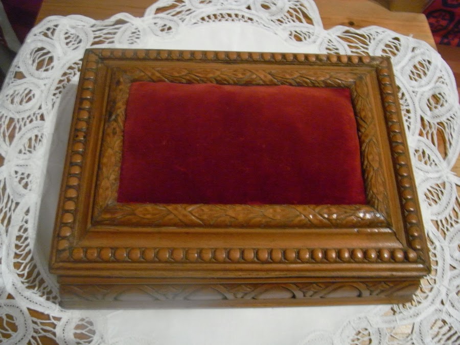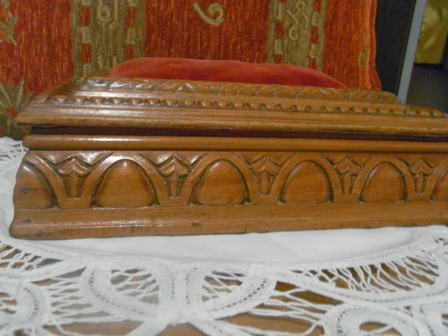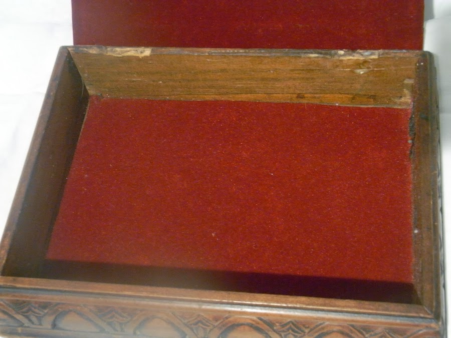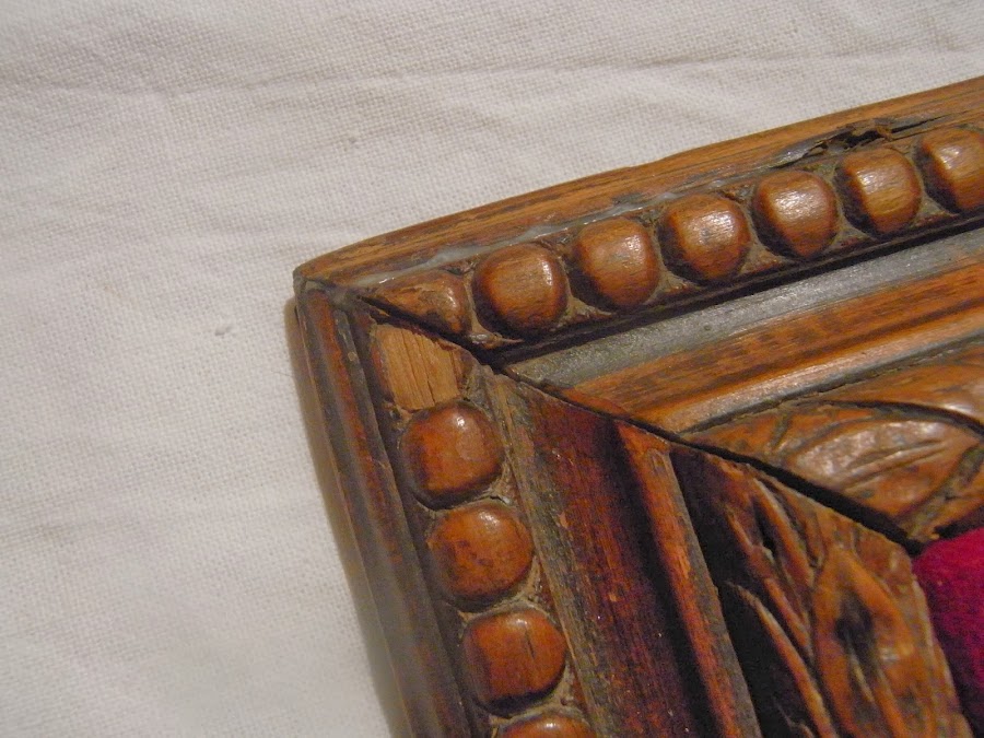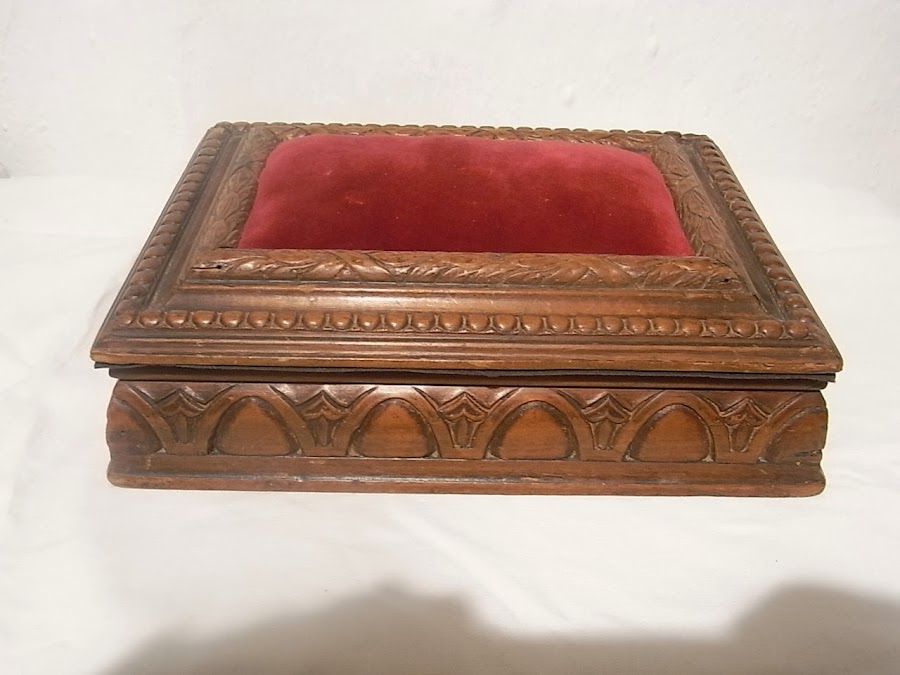 En madera de nogal y con talla barroca, probablemente de principios de siglo pasado.La adquirí en una subasta y forrado de fieltro rojo en su interior. La almohadilla superior para alfileres es original y quise mantenerla así a pesar de estar un poco desgastada.